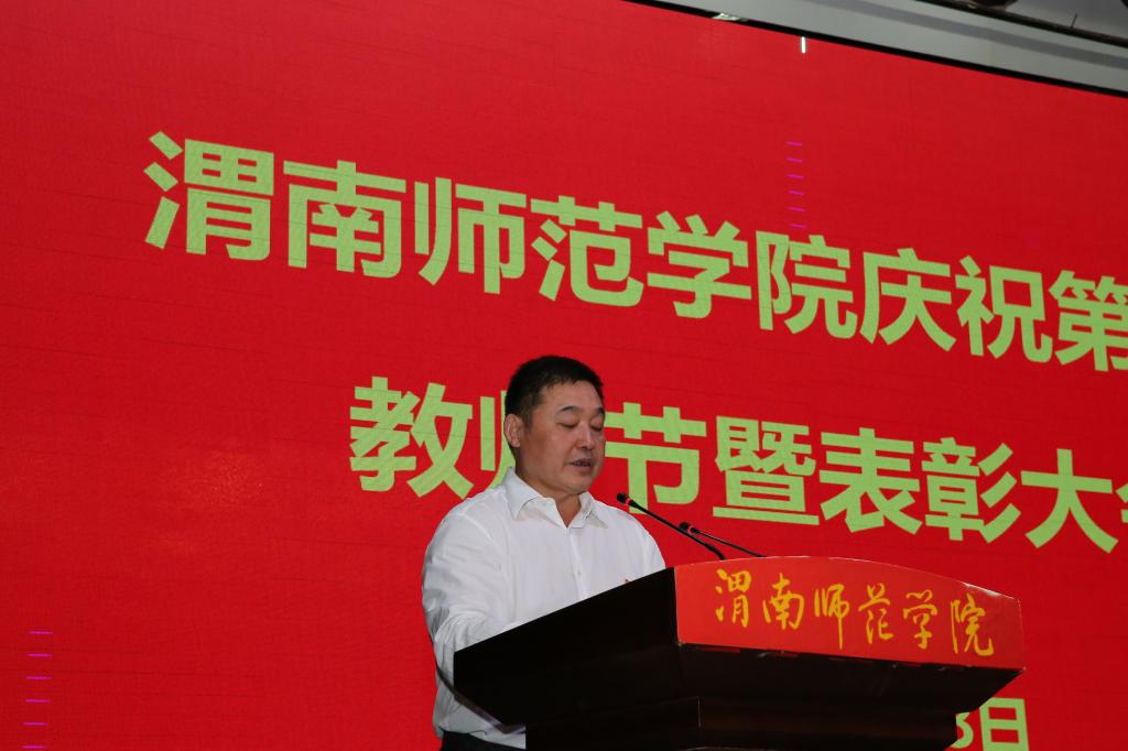会上,党委书记卓宇致辞。他向全体教职员工送上节日的祝福,向受到表彰的教师表示热烈的祝贺和崇高的敬意,并对全体渭师人在学校建设和发展中取得的优异成绩表示肯定。他强调,我们要认真学习贯彻习近平总书记关于教育的重要论述和“七一”重要讲话精神,铭记红色历史,传承红色基因,不忘教育报国初心,勇担立德树人使命,积极投身教育教学改革,努力为党育人、为国育才。他提出,要落实立德树人根本任务,努力提高做好思想政治教育工作的本领;树立良好师德师风,增强知识储备提升育人能力;积极探索新时代教育教学方法,不断提升教书育人本领;潜心教书育人,在严爱相济中让学生亲其师、信其道,他表示,近期学校将组织开展优秀教师事迹宣传、主题作品征集、教师座谈会、走访慰问一线教师、“为教师亮灯”等尊师主题月系列活动,这对于加强尊师文化建设、展示教师良好形象、增强教师教书育人使命感荣誉感都具有重要意义。他指出,学校要进一步关心教师成长需要,为广大教师营造安心从教的育人环境,以实际行动积极主动为教师排忧解难;要深入开展“我为师生办实事”实践活动,从教师工作生活中最现实的问题着手,用心用情用力解决教职工的急难愁盼事,坚持把好事办实,实事办好,以最大的决心营造教师安心、静心从教的环境,让教职工有更多的幸福感获得感。他希望,全体渭师人要始终坚持 “四个相统一”,努力做好学生的“四个引路人”,奋勇争当 “四有好老师”,担当好新时代人民教师的时代重任,不遗余力、满腔热情地奉献教育事业,在平凡的教书育人岗位上做出渭师人的新业绩、新贡献!