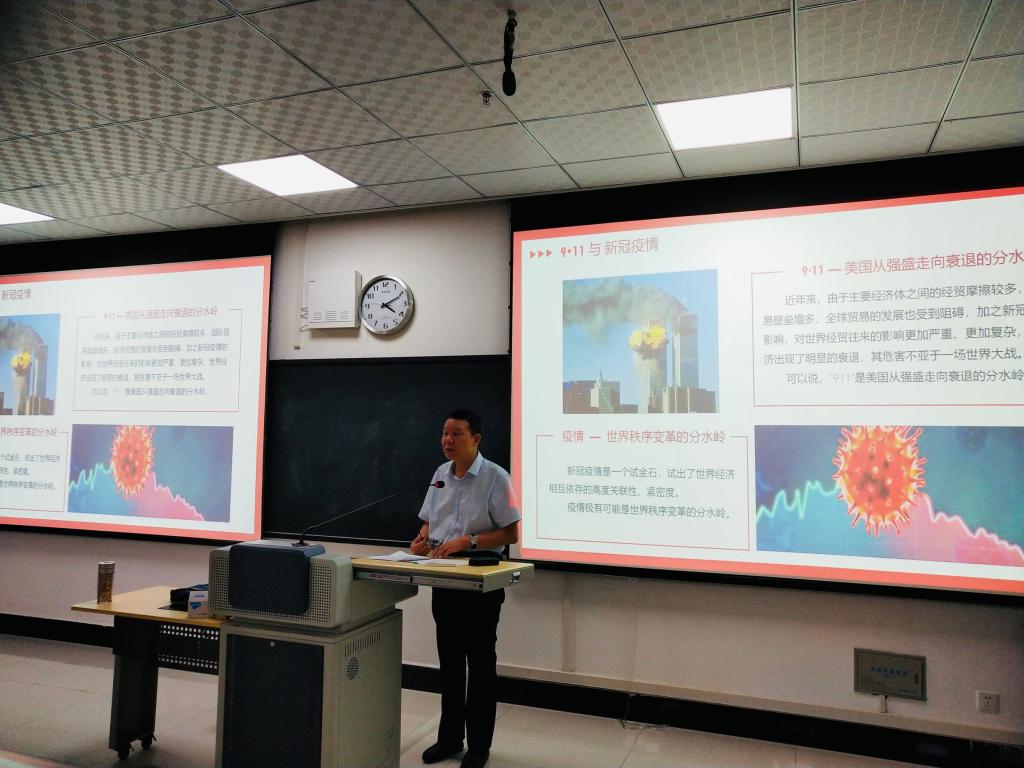 肖耀刚以《疫情背景下的国际秩序》为题,立足疫情对世界经济和秩序带来的广泛影响,深刻而全面地阐释了消费需求端、生产供应链以及国际资本市场发生的重大变化,着重强调了中美贸易战和美国所采取的“量化宽松政策”对世界主要大国关系尤其是中美关系带来的重要影响,科学分析了中国的发展现状与发展道路。他指出,尽管“西强我弱”的格局仍未根本改变,但“东升西降”的大趋势不可阻挡,时与势在我们这一边,中国的崛起已成为必然。他强调,我们要抓住机遇强身健体,坚定走合作共赢道路,坚持多边主义,坚定维护以联合国为核心的国际体系,坚持以国际法为基础的国际秩序,维护以联合国宪章宗旨和原则为根基的国际关系基本准则,为人类社会的发展进步提供中国方案、贡献中国力量。