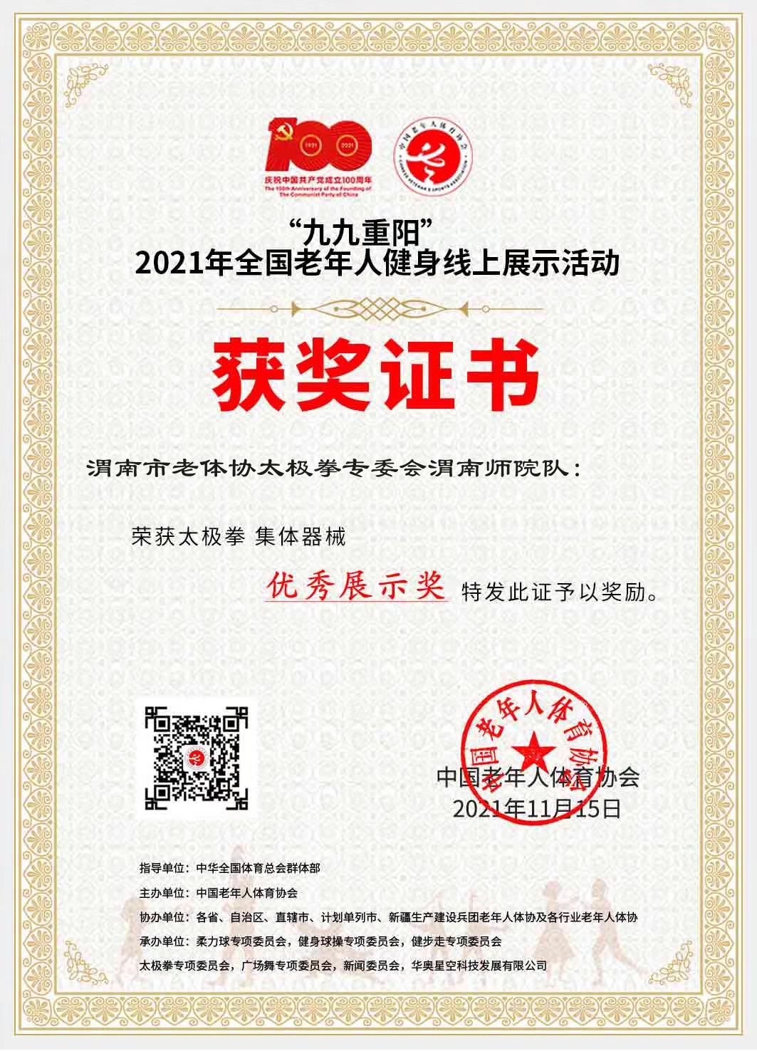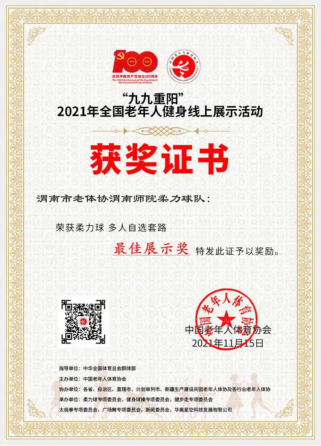近日,纽约国际官网离退休工作处老年艺术团参加“九九重阳”2021年全国老年人健身线上展示活动,其中,纽约国际官网柔力球队“最美不过夕阳红”荣获“自选套路最佳展示奖”; 拳剑队的“32式太极剑”荣获“太极拳集体器械优秀展示奖”, 拳剑队的“24式太极拳”荣获“太极拳集体拳术优秀展示奖”。
