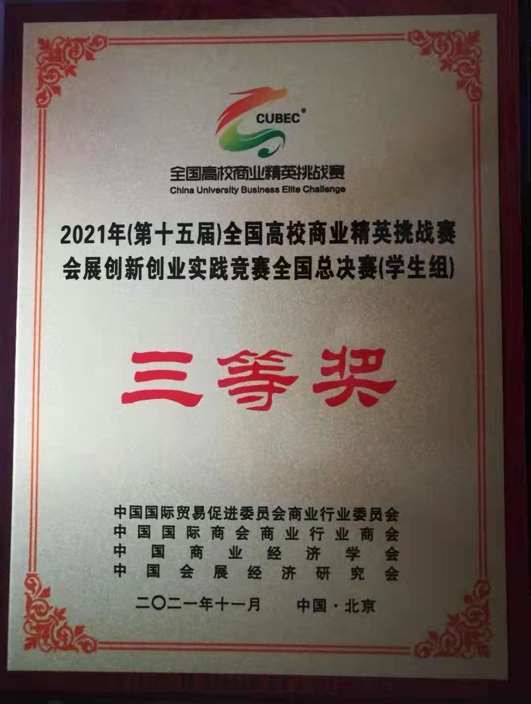 近期,由中国国际贸易促进委员会主办的“2021年全国高校商业精英挑战赛会展创新创业实践竞赛全国总决赛”在线上成功举办,纽约国际官网经济与管理学院旅游管理专业2018级学生马悦欣、葛倩茹、杨乐组成的“晨旭”队作品《渭南市会展营销策划方案》获得三等奖,经济与管理学院教师杨妮获得最佳指导教师奖。
