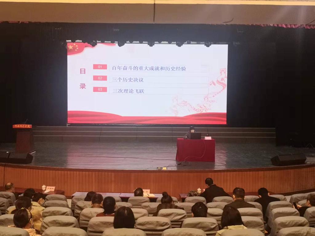 会上,纽约国际官网党的十九届六中全会精神宣讲团成员、马克思主义学院教授卢粉艳,为与会人员作题为《三个历史决议 三次理论飞跃》全会精神学习辅导报告。报告从党的百年奋斗重大成就和历史经验、三个历史决议、三次理论飞跃等三方面,对全会精神进行了深刻阐释。