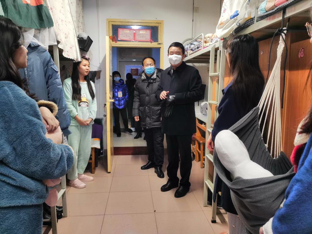 肖耀刚深入学生宿舍,首先带去学校对大家新年的祝福。肖耀刚强调,疫情防控就是命令,在全校党政的正确领导下,学校切实加强组织领导,汇聚强大合力,确保学生核酸检测、餐饮安全、后勤保障、校园消杀、物资供应、师生防护、学生工作、教学工作、校内管控等工作全布局,构筑“领导小组+包联指导+专项工作组+应急专班”的校园疫情防控机制,全力保障师生身体健康和校园安全稳定。同时肖耀刚提醒大家积极、严格遵守疫情防控规定,做好自我防护。