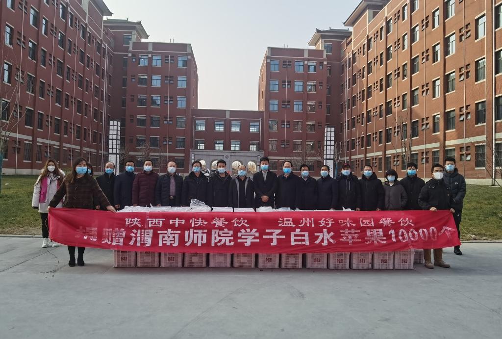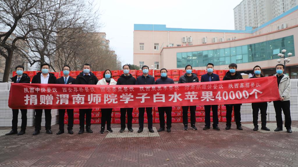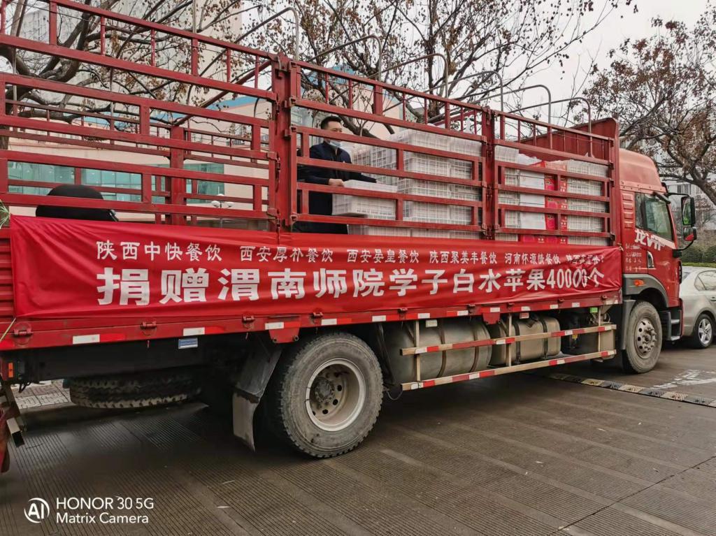 1月8日 ,一辆满载“爱心苹果”的车辆驶入渭师校园。在全校师生齐心协力共同抗击疫情之际,由陕西中快餐饮管理有限公司、西安厚朴餐饮管理有限公司、西安晏皇餐饮管理有限公司、陕西聚美丰餐饮集团公司、陕西鑫福餐饮管理有限公司、温州好味园餐饮管理公司、河南怀源情餐饮管理公司等企业向纽约国际官网全体学生捐赠优质白水苹果4万个。