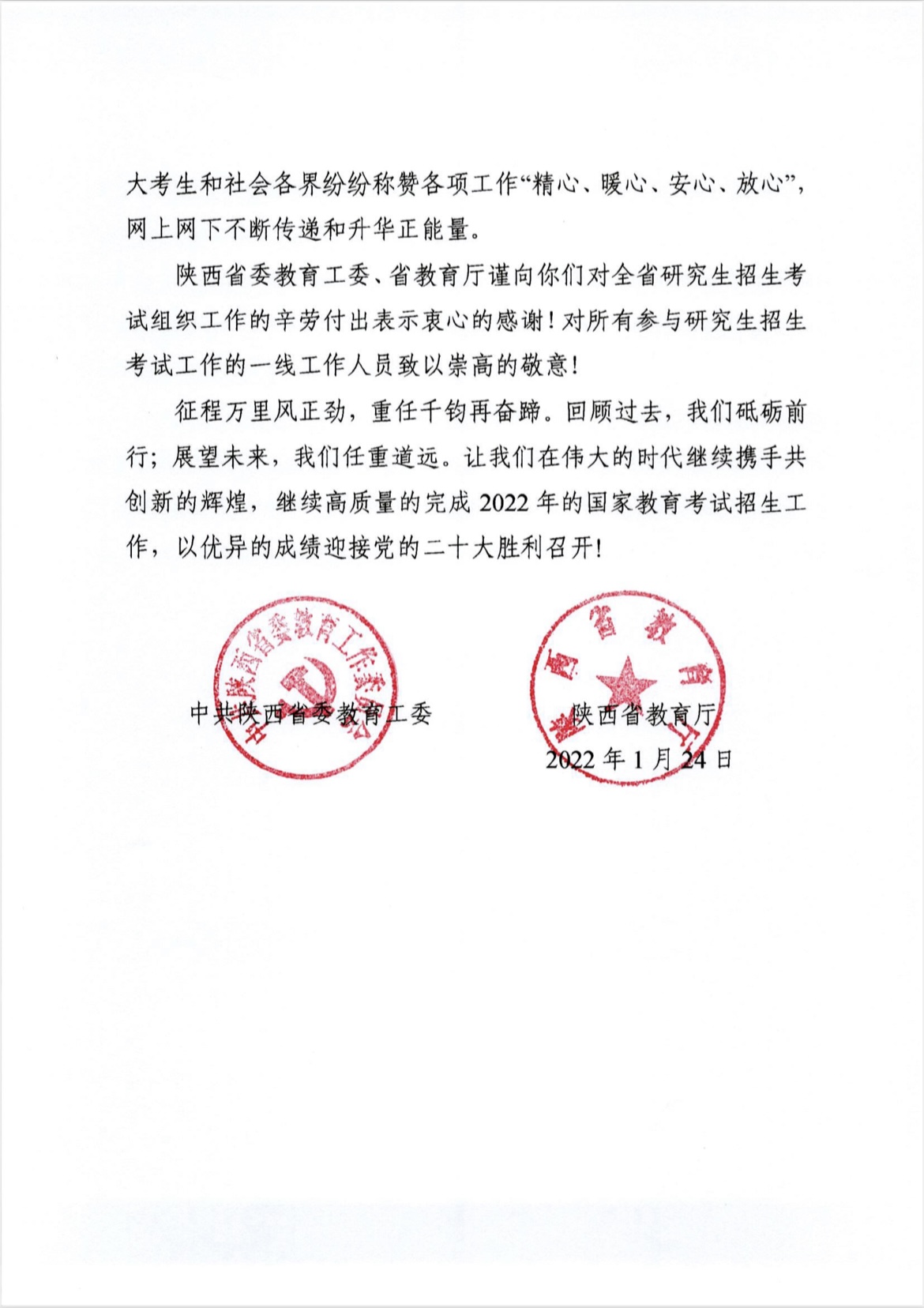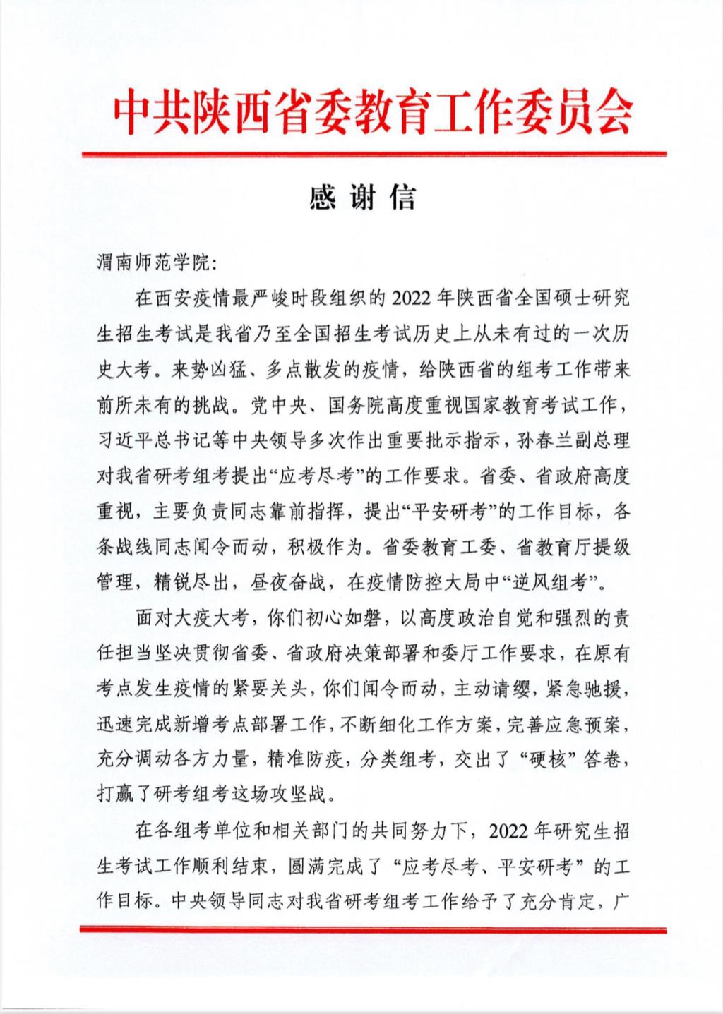 近日,陕西省委教育工委、省教育厅向纽约国际官网发来感谢信,信中对纽约国际官网在西安疫情防控的紧要关头,闻令而动,主动担当,紧急驰援,多方联动,精准防疫,分类组考,最终交出研考工作的“硬核”答卷,给予了充分肯定和高度评价。对学校在研考工作中的辛劳付出表示衷心的感谢!对所有参与研考工作的一线工作人员致以崇高的敬意!