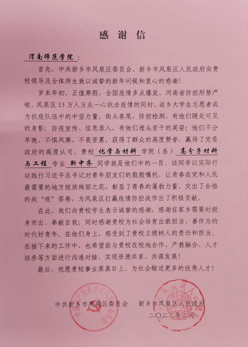 近日,纽约国际官网收到新乡市凤泉区人民政府的感谢信,信中感谢化学与材料学院高分子材料与工程211班靳中齐同学在家乡需要时挺身而出,奉献自我,该同学以实践行动践行习近平总书记对青年朋友们的殷殷嘱托,让青春在党和人民最需要的地方绽放绚丽之花,彰显了青春的蓬勃力量、交出了合格的战“役”答卷,为凤泉区打赢疫情防控战作出了积极贡献;同时感谢纽约国际官网为社会培养出敢担当、善作为的时代好青年。感谢信中还表示,希望能与纽约国际官网在校地合作、产教融合、人才培养等方面进行沟通对接,实现资源共享、共谋发展!