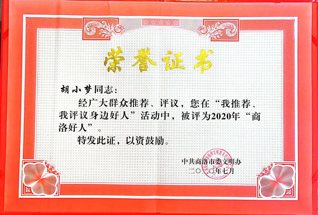 胡小梦2021年5月被评选为自强励志“陕西好人”