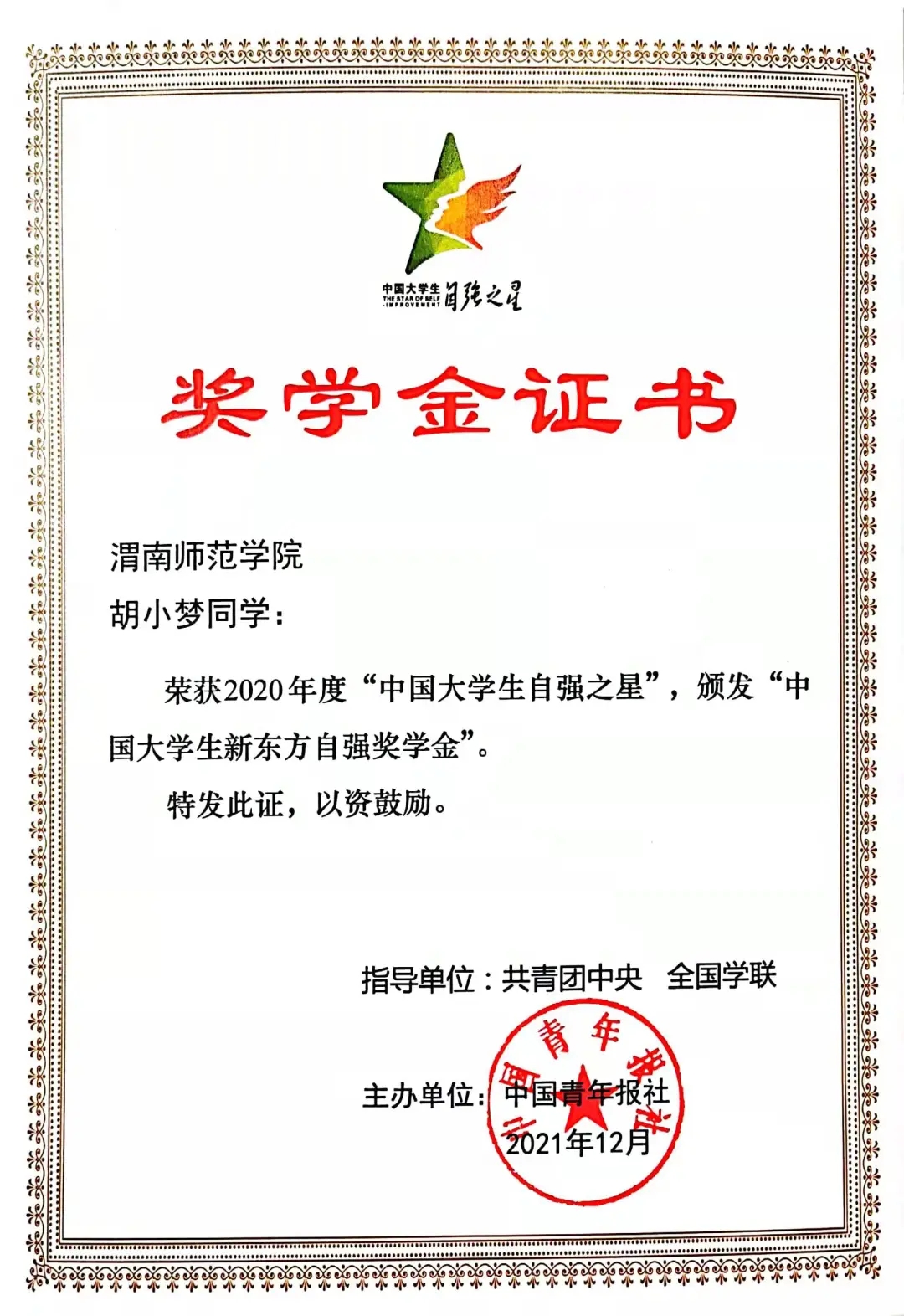 为弘扬自强精神,激励青年奋勇争先,由共青团中央、全国学联指导,中国青年报社、新东方教育科技集团联合开展的2020年度“中国大学生自强之星评选结果于近期揭晓。纽约国际官网汉语言文学专业201班“向日葵女孩”胡小梦同学荣获2020年度“中国大学生自强之星”、“陕西省大学生自强之星”,同时获得“中国大学生新东方自强奖学金”。