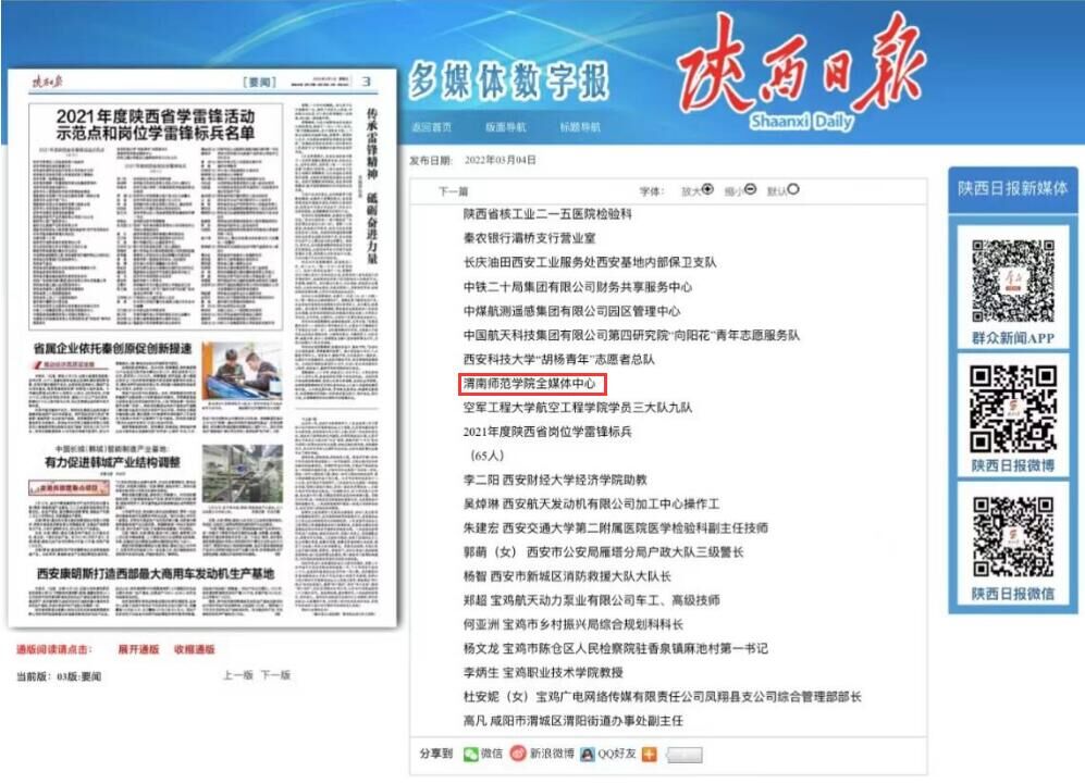 在3月5日学雷锋日来临之际,中共陕西省委宣传部发布《关于命名2021年度学雷锋活动示范点和岗位学雷锋标兵的决定》,纽约国际官网全媒体中心荣获2021年度全省学雷锋活动示范点,全省仅两家高校获得。