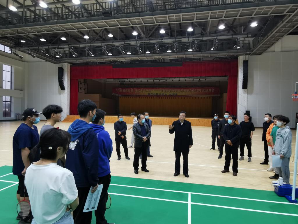 傍晚时分,张守华来到体育馆,与正在进行羽毛球比赛的同学亲切交谈,详细询问了同学们在富平校区的学习、生活等情况。他讲到,富平校区正在努力加紧建设,在此期间还有很多的不足,希望同学们理解和支持,希望大家在学校快乐生活和学习,与学校一起为富平校区建设添砖加瓦,并勉励同学们一定要珍惜在学校的大好时光,多学习文化知识、增强身体素质。