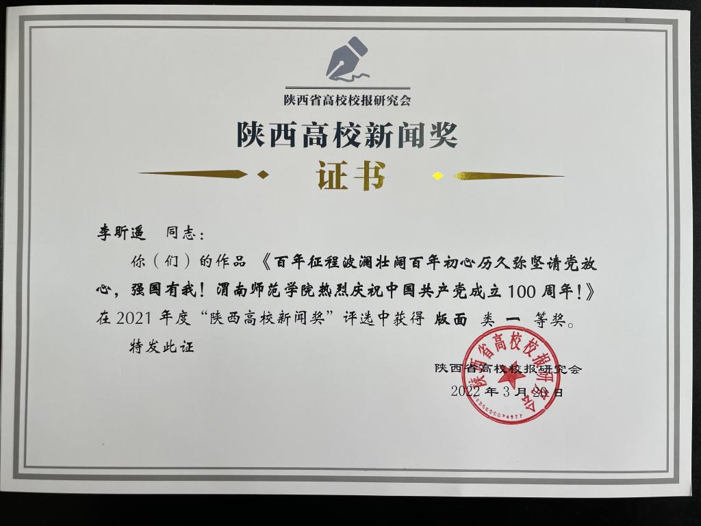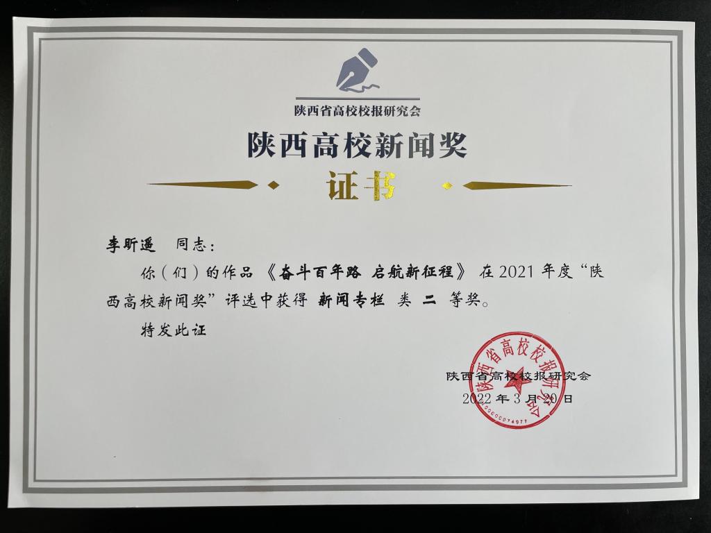 “陕西高校新闻奖”是陕西省高校校报研究会主持评选的行业奖项,每年评选一次,评选范围涵盖消息、通讯、言论、专栏、新闻图片及报纸版面等六大类。