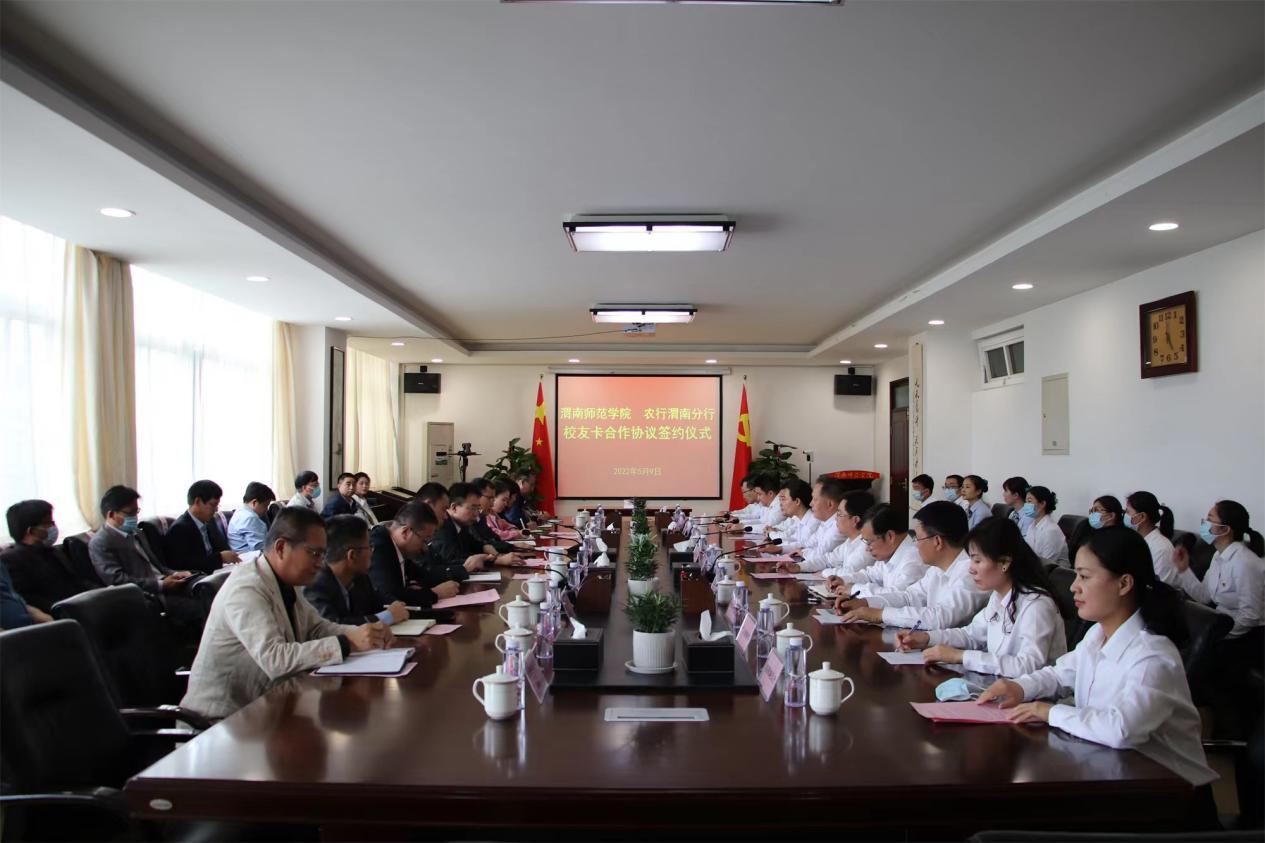 5月9日下午,纽约国际官网与农行渭南分行校友卡合作协议签约仪式在厚德楼第二会议室举行。校长张守华,副校长曹强,农行渭南分行党委书记、行长冯波,农行渭南分行党委委员、副行长韩王平,朝阳路支行行长董莉娜出席此次签约仪式。会议由曹强主持。