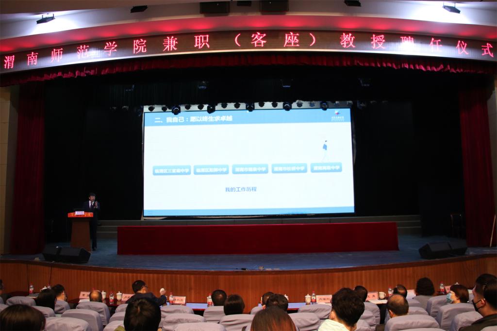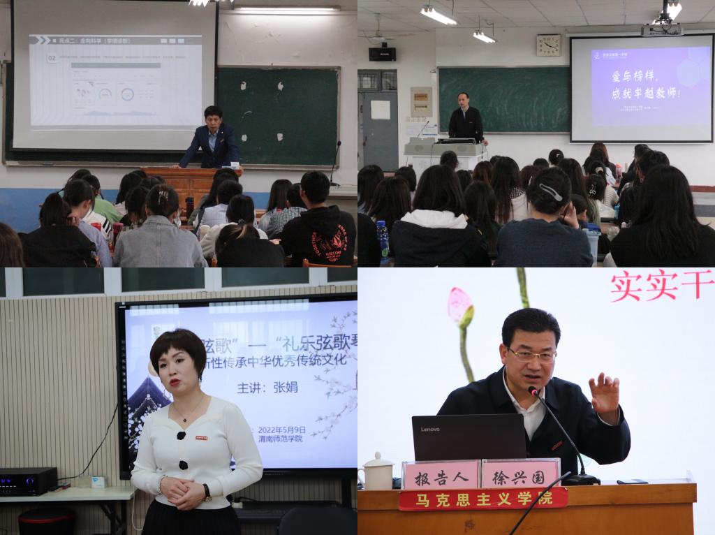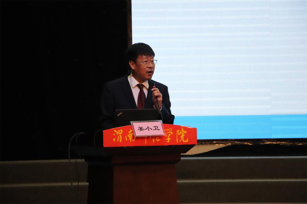 渭南高级中学校长、全国优秀教师姜小卫在学校演艺厅作了题为《做追求卓越的教育新人》的报告,学校党委委员、二级学院院长及各专业师范生代表参加报告会。渭南小学校长、全国模范教师郗莉,澄城中学校长王会香分别为人文学院师范生作了题为《适性教育引领发展微笑课堂共生共长》《卓越青年教师成长力构建》的报告,渭南高级中学、全国优秀教师张华文,合阳中学英语教师王军玲分别为外国语学院师范生作了题为《教书育人的故事》《感受幸福 静待花开》的报告,渭南中学校长马根福为化学与材料学院师范生作了题为《挑战未来,你准备好了吗?》的报告,富平迤山中学校长赵和平,杜桥中学校长贺启发,渭南高新中学校长孙佑治,澄城城关中学校长鲁九云分别为物理与电气工程学院师范生作了题为《教师这个职业就很好》《精准目标叙写 打造高效课堂》《让精彩发生在重点突破的时候》《信息化促进基础教育改革》的报告,渭南高级中学教师张娟为音乐学院师范生作了题为《创新性传承中华优秀传统文化之“礼乐弦歌”——“鸣鸠琴”》的报告,宜川中学教育集团总校长徐兴国为马克思主义学院师范生作了题为《用“爱心和责任”谱写教育之歌》的报告,西安市高新第一学校副校长车大鹏为数学与统计学院师范生作了题为《爱与榜样成就卓越教师》的报告。