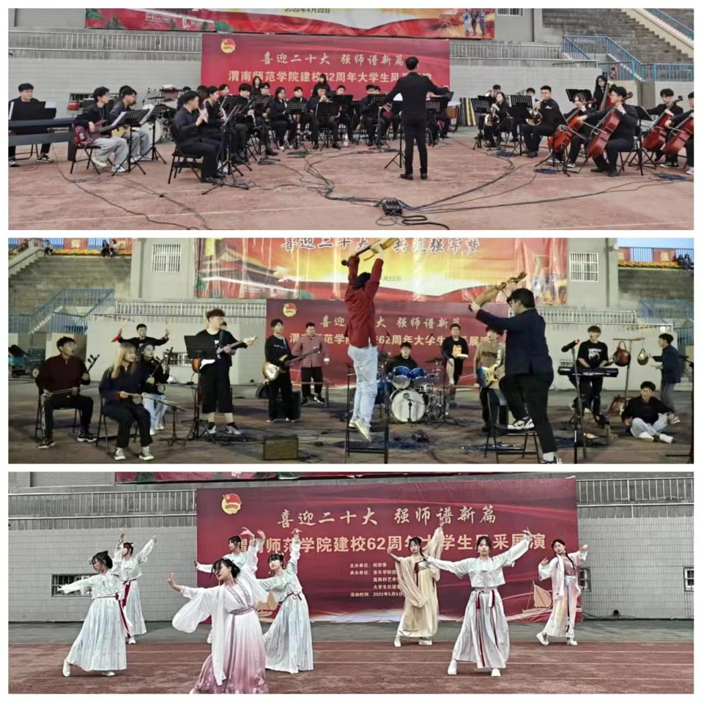 5月9日至5月13日,在田径场内,举办大学生风采展演,音乐学院团总支、莫斯科艺术学院团总支、大学生社团,带来一场场精彩的文艺表演,大学生管弦乐团激情澎湃,大学生老腔艺术团秦音苍劲,汉服协会舞姿轻盈,艺源吉他社弹唱欢快,动人的旋律,优美的舞姿,展现青年学生的朝气蓬勃,歌颂母校60余载的累累硕果,渭师学子们以青春热情表达对母校浓浓情意。
