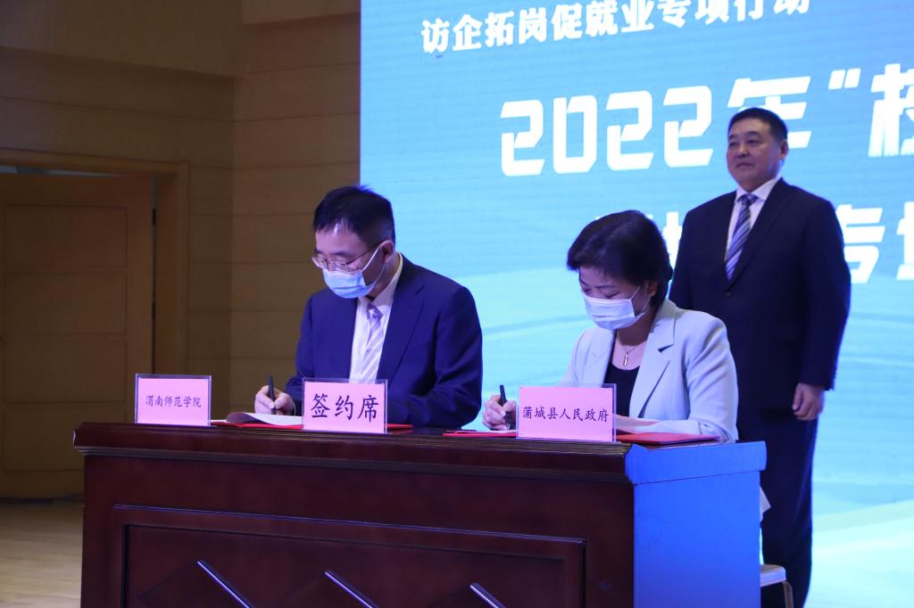 在观看了宣传片后,校长张守华与蒲城县委常委、常务副县长陈改萍代表校地双方签订《588888纽约国际线路与蒲城县人民政府协同发展合作协议》,化学与材料学院院长焦更生与蒲城海泰新材料产业有限责任公司总经理胡宗学签订《588888纽约国际线路共建大学生就业基地协议书》。张守华为蒲城海泰新材料产业有限责任公司授大学生就业基地牌。随后,中共蒲城县委书记张毅锋宣布招聘会开始。与会领导在招聘会现场与用人单位亲切交流,并看望了参加招聘会的毕业生,鼓励他们找准目标、积极求职、尽早签约。