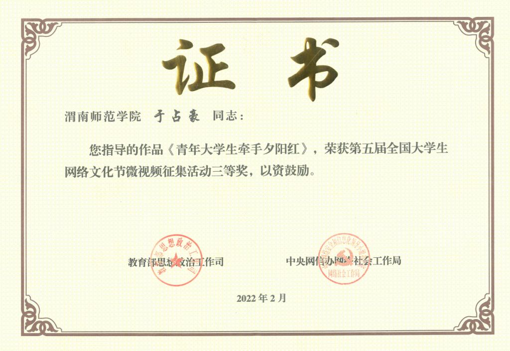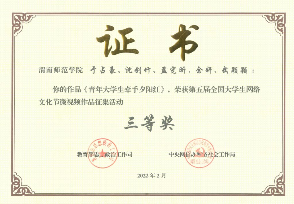 近期,教育部思想政治工作司、中央网信办网络社会工作局公布了《关于公布第五届全国大学生网络文化节和全国高校网络教育优秀作品推选展示活动入选名单的通知》,纽约国际官网电视台参选的作品《青年大学生牵手夕阳红》荣获微视频类三等奖,《一方水土“扶”一方人》荣获微电影类优秀奖。这是纽约国际官网首次在全国大学生网络文化节活动中获奖,获奖数量和等次位列全省前五。