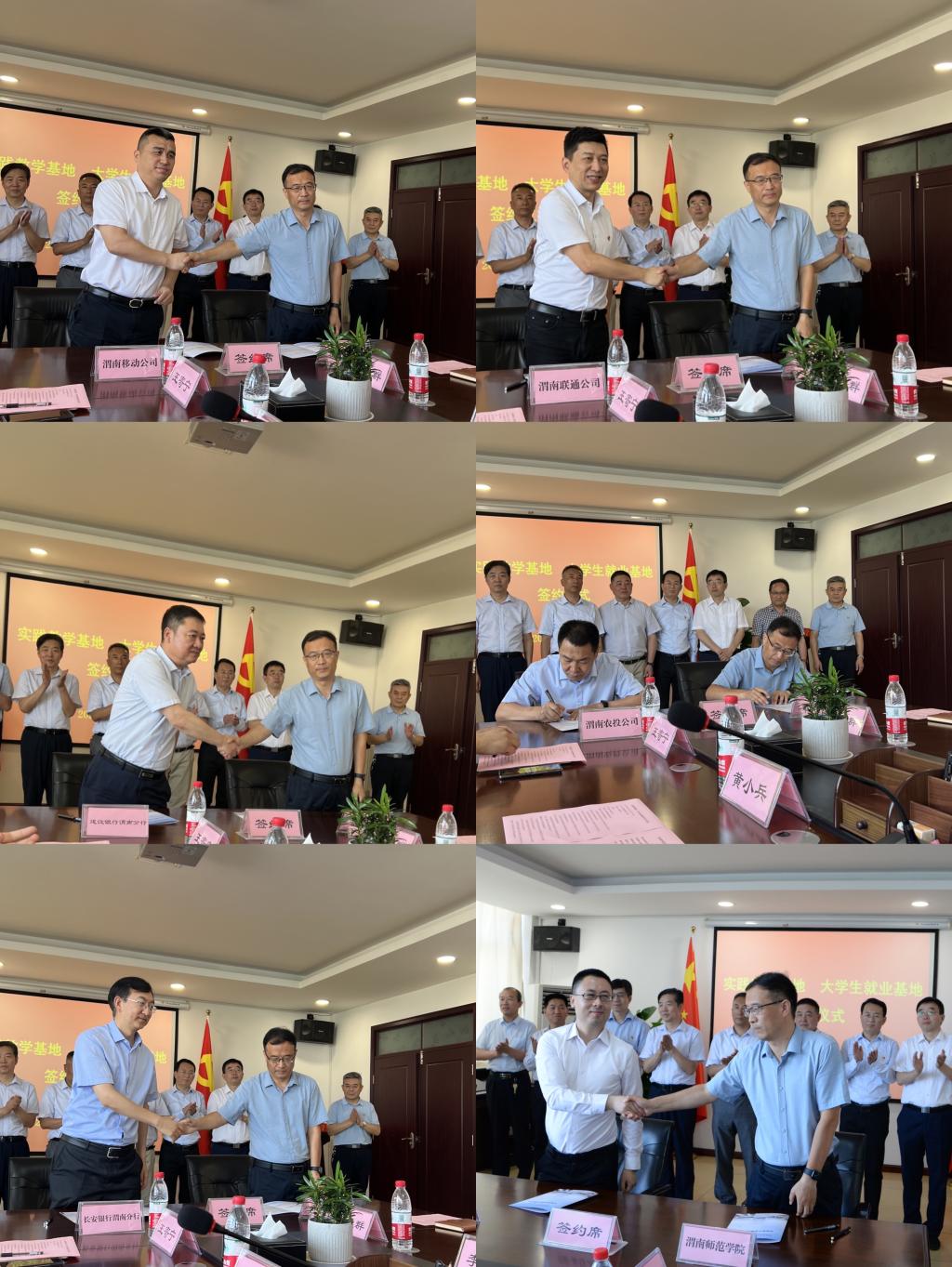 6月16日上午,学校与多家单位签订实践教学基地、就业基地协议书。当天,分别与工商银行渭南分行、建设银行渭南分行、长安银行渭南分行、中国移动渭南分公司、中国联通渭南分公司、渭南市农业投资集团有限公司签订实践教学基地协议书,与中国移动渭南分公司、中国联通渭南分公司、渭南市农业投资集团有限公司签订大学生就业基地协议书。