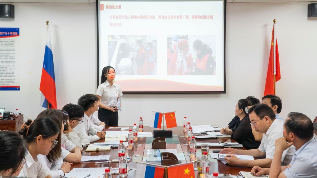 第二十八届学生会执行主席、莫斯科艺术学院学前教育181班王子茵讲题为《青春正奋斗 为国正当时》主题团课,她以习近平总书记在建团100周年大会上的讲话精神为主线,回顾了建团百年的光荣历史,列举了大学生身边的青春榜样,表达了青年一代勇担时代使命,矢志报效祖国的决心。