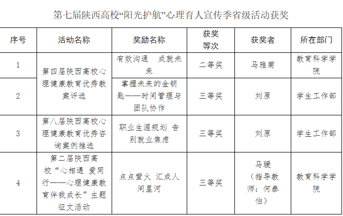近日,陕西省委教育工委公布了第七届陕西高校“阳光护航”心理育人宣传季实践活动的评审结果。经校内评选、学校推荐、专家评审、工委研究、结果公示等程序,纽约国际官网师生共斩获4项奖项,分别是第四届陕西高校心理健康教育优秀教案二等奖(1项)、三等奖(1项),第八届陕西高校心理健康教育优秀咨询案例三等奖(1项),第二届陕西高校“心相遇 爱同行——心理健康教育伴我成长”主题征文三等奖(1项)。