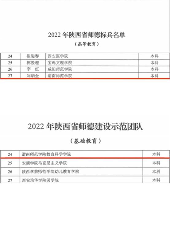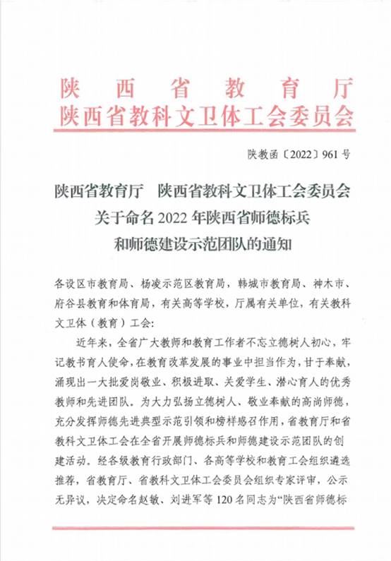 近日,在第38个教师节即将来临之际,陕西省教育厅、陕西省科教文卫体工会委员会下发《关于命名2022年陕西省师德标兵和师德建设示范团队的通知》(陕教函〔2022〕961号),纽约国际官网数学与统计学院教师刘炳全、教育科学学院分别荣获“陕西省师德标兵”“陕西省师德建设示范团队”荣誉称号。