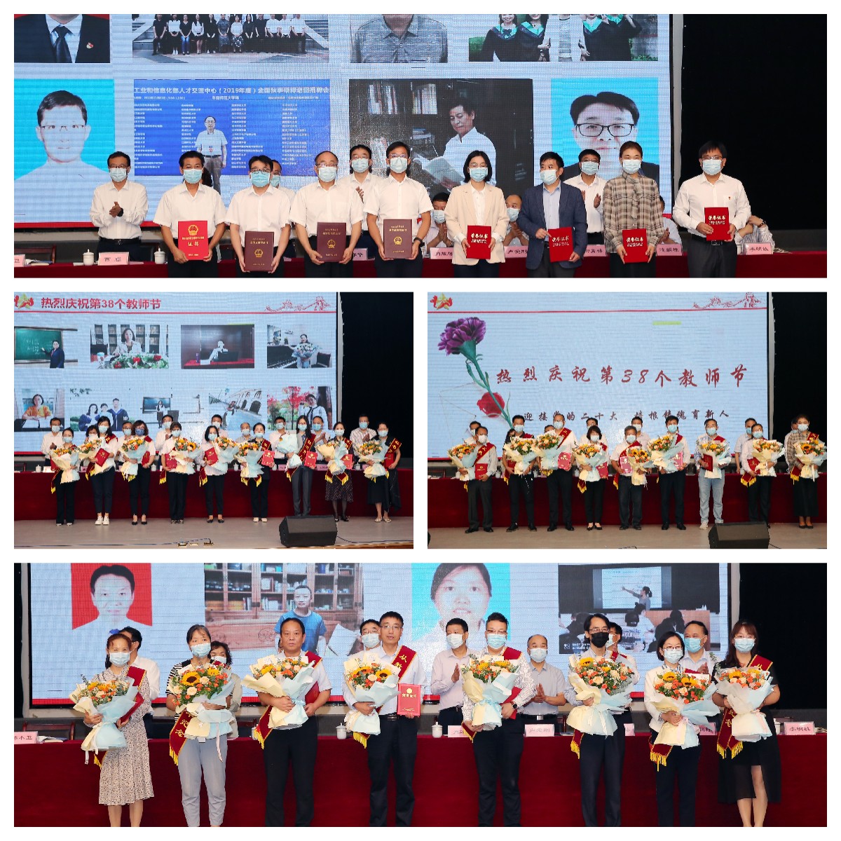 学校领导为省级师德标兵刘炳全、省级师德建设示范团队代表梁燕玲,陕西学校思政课“教学团队能手”获得者马忠智,陕西第四届本科高校课堂教学创新大赛三等奖获得者杨晓菲,陕西省2021年高等教育教学成果奖一等奖代表陈斌、二等奖代表白赵峰、王冬华,陕西省第十五次哲学社会科学优秀成果奖获得者王炳社、陶生奎颁发荣誉证书;为王晓红等5位学校2022年“教书育人楷模”、周菊芳等20位“最美教师”、白秀英等19位在教育战线工作满三十年的教师和教育工作者颁发荣誉证书,并由学生代表为他们敬送花束。