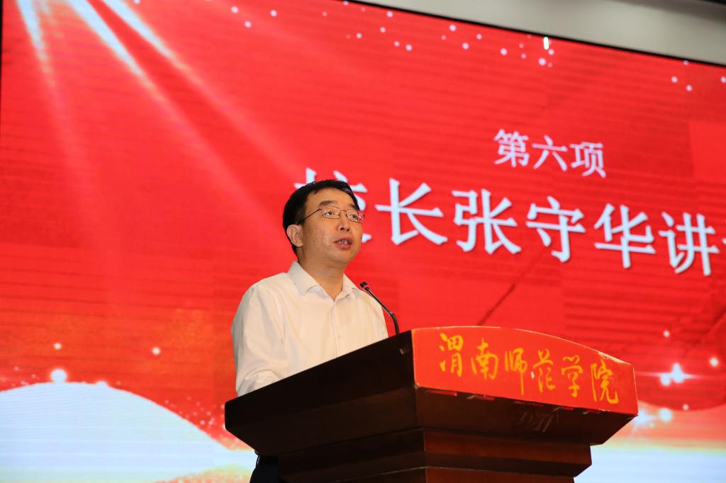 随后,校长张守华代表学校向全体教职员工致以节日祝福,向为学校发展作出贡献的离退休老同志致以亲切问候,向在教育战线工作满三十年的教师和教育工作者表示崇高敬意,向受表彰的先进集体和先进个人表示热烈祝贺。接着,总结了学校一年来的工作,对全体渭师人在学校建设和发展中取得的优异成绩表示肯定。他希望,全体教职工要坚持践行立德树人使命,要坚持教书和育人、言传和身教、潜心问道和关注社会、学术自由和学术规范“四个相统一”。要坚持建设高素质教师队伍,把加强教师队伍建设作为一项重大政治任务和根本性民生工程,把师德师风作为评价教师队伍素质第一标准,用高尚的师德给予学生最生动、最深远的示范教育,做学术道德和良好风气的坚守者、维护者和弘扬者。要坚持知重负重攻坚克难,在学校申硕攻坚的重要时刻,要深刻认识学校所处的“时”和“势”,增强忧患意识,保持战略定力,锚定发展目标,固根基、扬优势、补短板、强弱项、扩开发,坚持内涵发展、特色发展和高质量发展,知重负重,攻坚克难,奋力谱写好新时代学校高质量发展新篇章。
