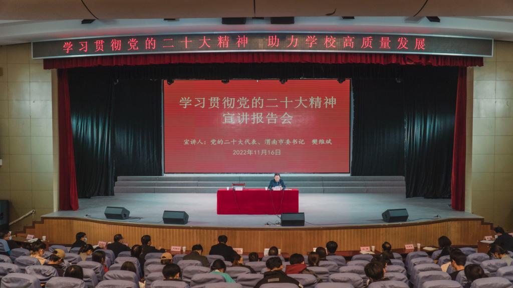 11月16日,党的二十大代表、渭南市委书记樊维斌走进纽约国际官网为师生代表宣讲党的二十大精神。党委书记卓宇主持报告会。