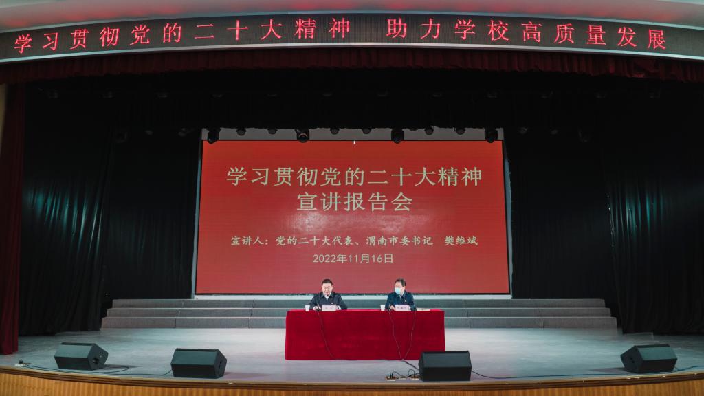 渭南市委秘书长王小平,纽约国际官网党委委员、处级干部、师生代表近200人聆听宣讲报告会。