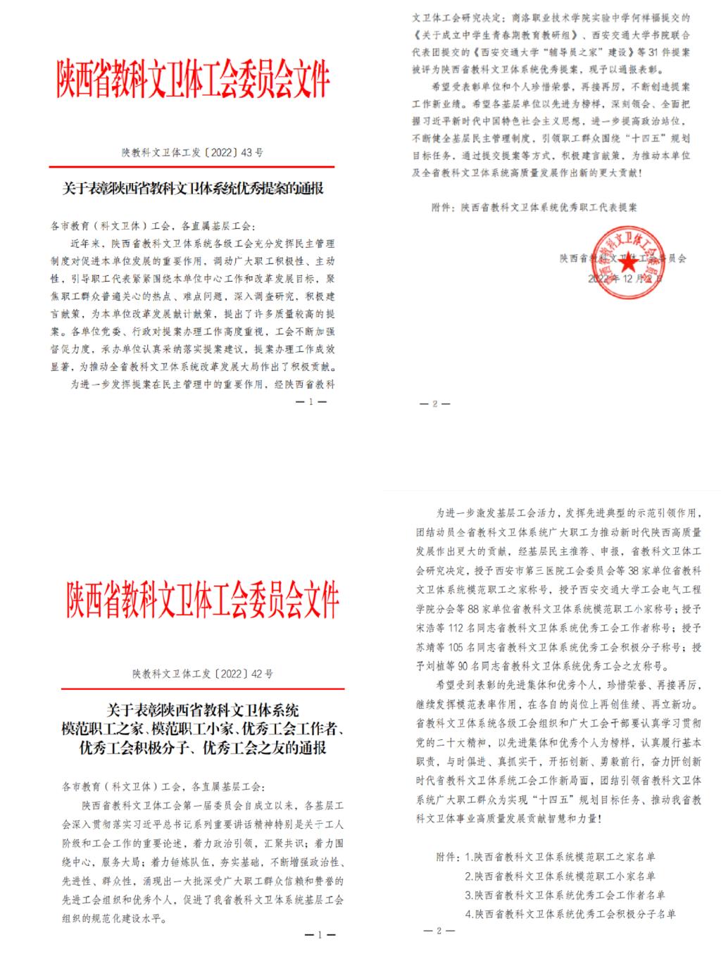 近日,陕西省教科文卫体工会对陕西省教科文卫体系统优秀提案与陕西省教科文卫体系统模范职工之家、模范职工小家、优秀工会工作者、优秀工会积极分子、优秀工会之友进行表彰通报。