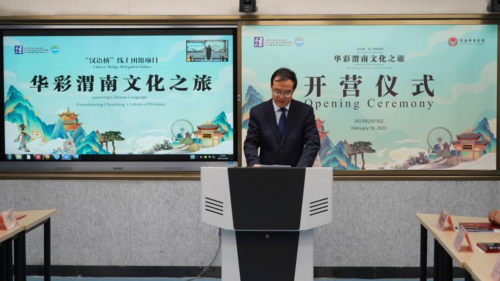 2月18日北京时间15:00,纽约国际官网举行“汉语桥”线上团组项目——华彩渭南文化之旅体验营开营仪式。副校长曹强出席仪式并讲话。开营仪式由国际教育学院院长杜百顺主持。