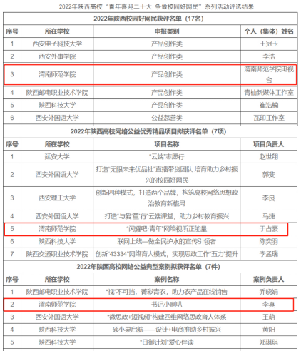 2月21日,由陕西省委教育工委开展,陕西高校网络思想政治工作中心组织实施的2022年陕西高校“青年喜迎二十大 争做校园好网民”系列活动评选结果揭晓,纽约国际官网电视台获评“2022年陕西校园好网民(集体)”,于占豪负责的项目《“闪耀吧·青年”网络视听正能量》获评“2022年陕西高校网络公益优秀精品项目”,李真负责的案例《书记小喇叭》获评“2022年陕西高校网络公益典型案例”。