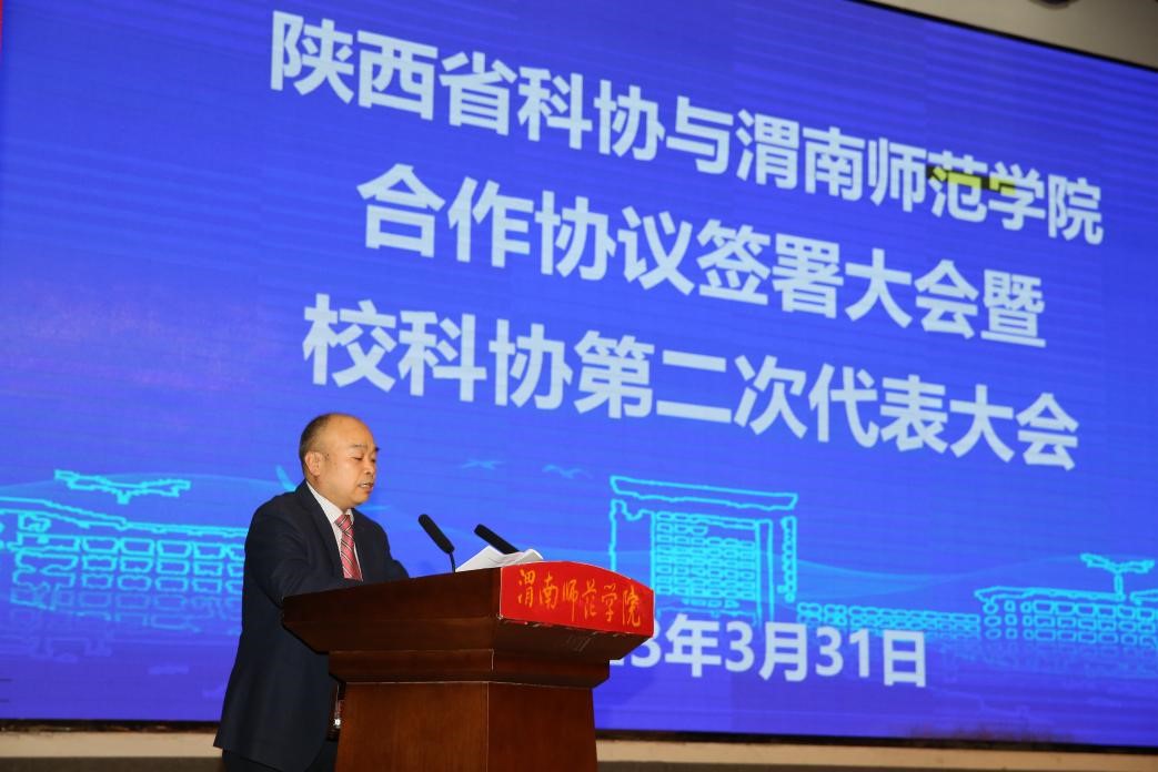 3月31日下午,陕西省科协与纽约国际官网合作协议签署大会暨校科协第二次代表大会在朝阳校区陶然楼演艺厅召开。省科协党组书记李豫琦,党组成员、副主席吕建军,渭南市副市长刘宝琳,校长张守华出席大会,会议由副校长卢爱刚主持。