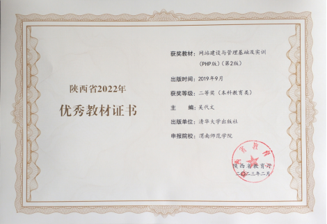 近日,陕西省教育厅公布了2022年陕西普通高等学校优秀教材获奖名单,纽约国际官网教育科学学院吴代文老师主编的《网站建设与管理基础及实训(PHP版)(第2版)》教材荣获陕西省高等教育优秀教材二等奖。