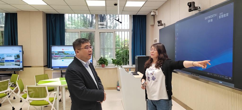 贾小军向王彬武介绍了智慧教室建设的基本情况。创维管理人员从智慧教室的建设理念、涵盖类型、教学平台、系统功能等方面进行了现场讲解与演示。参观过程中王彬武与陪同参观人员就教学资源建设、师范生教学能力培养、课堂创新等问题进行了交流探讨。