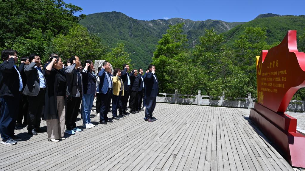 在牛背梁月亮垭观景台现场教学点,大家面对巍巍秦岭,重温总书记的殷殷嘱托,学习习近平总书记在月亮垭发表的重要讲话精神,认真听取了牛背梁董事长、党支部书记、高级工程师周恒讲授的《踏着总书记足迹,重温总书记讲话,感悟国之大者》专题党课,重温入党誓词。