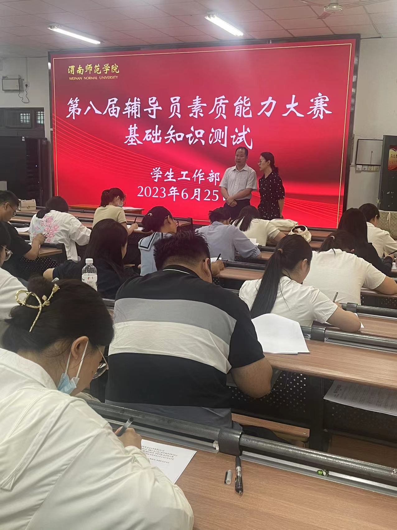 6月25日下午,全体专职辅导员在1101教室参加辅导员素质能力大赛第一环节基础知识测试。党委副书记汪勇亲临现场巡考。