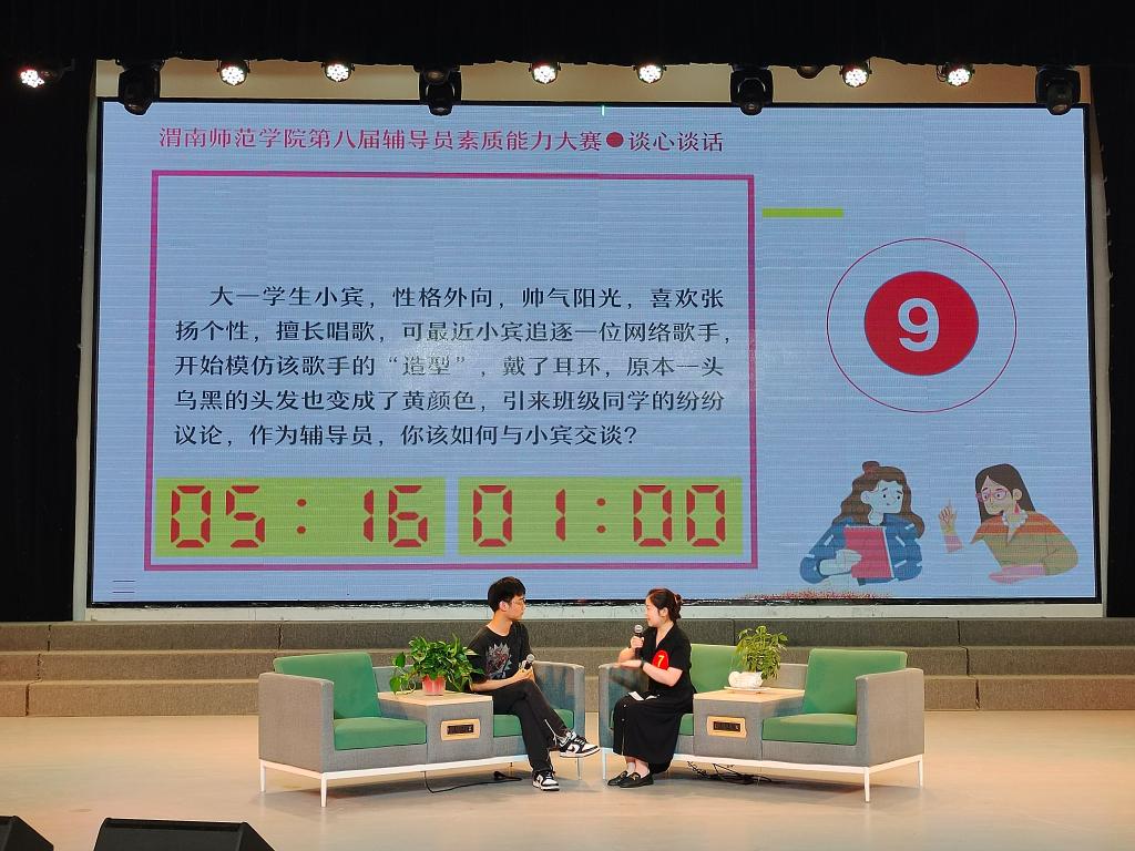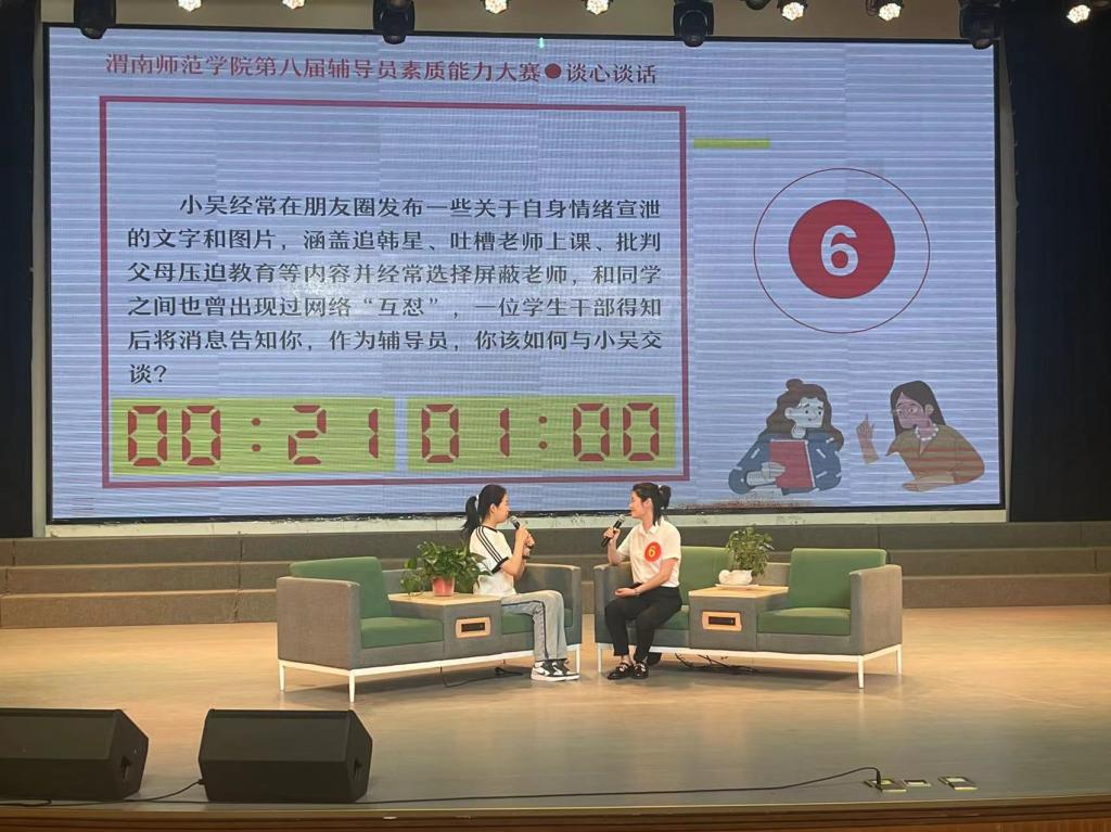 比赛现场,辅导员与学生以情景再现的方式进行谈心谈话,主要考察辅导员对学生特征、成长成才规律的了解把握程度,对学生的教育引导能力,解决理论困惑和实际问题的能力等。谈话完后辅导员进行简短总结并回答评委现场提问。辅导员老师和学生精彩互动不时引发现场热烈反应。