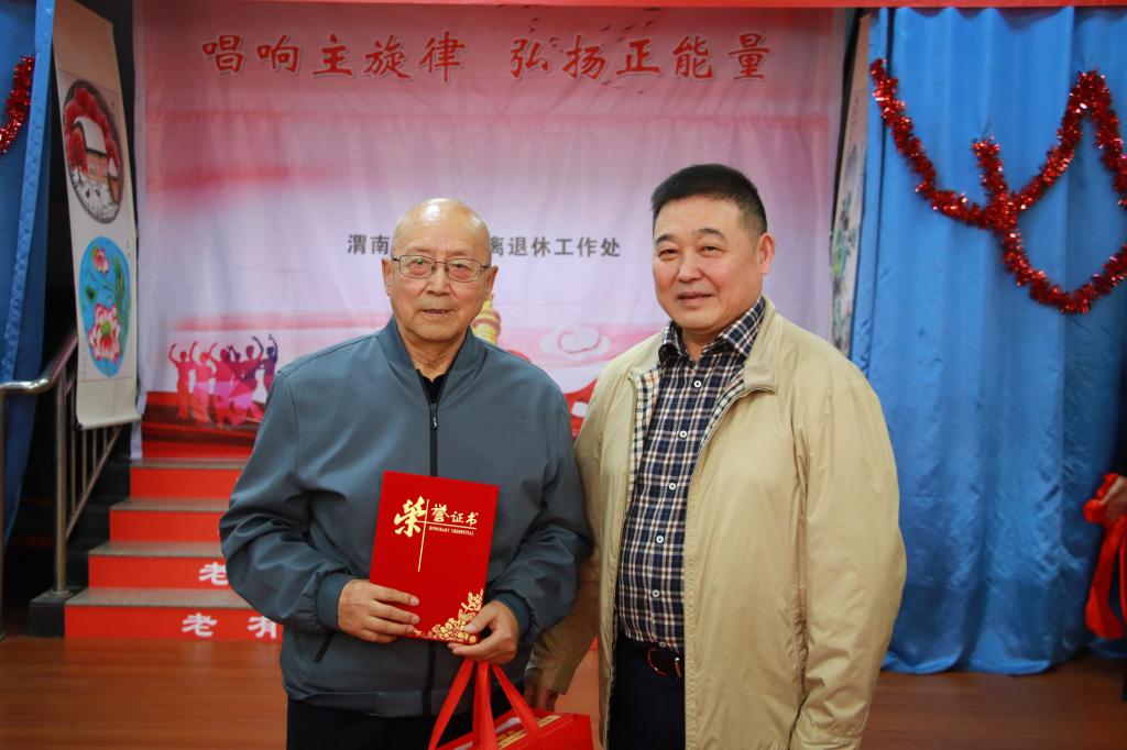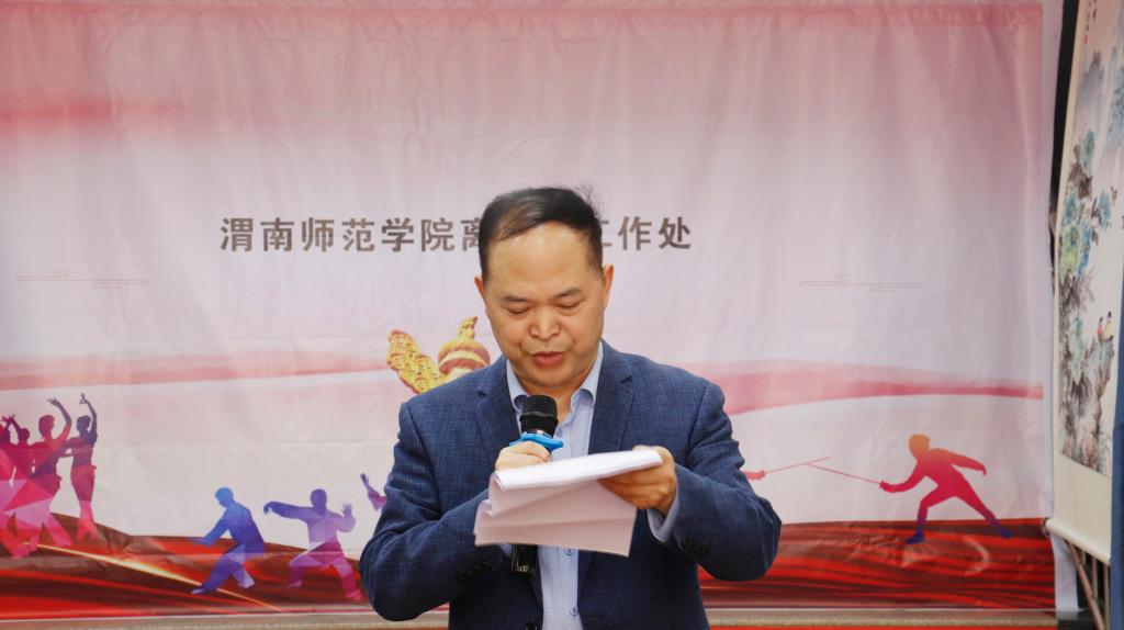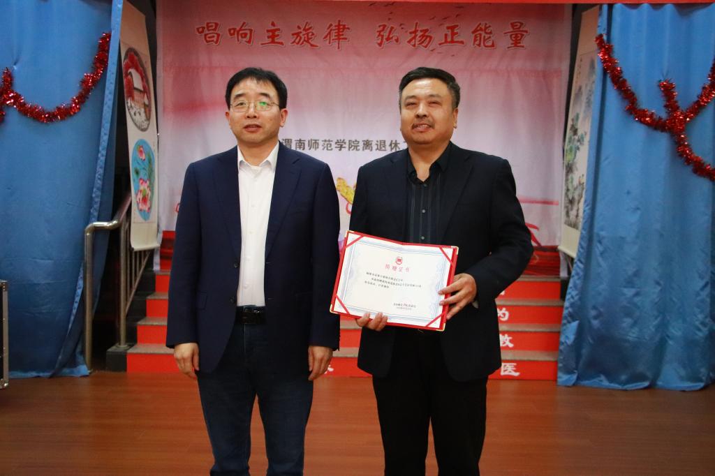 凌朝栋代表学校领导讲话,对全体离退休老同志致以节日的祝贺,向前来参加活动的来宾表示热烈的欢迎,并希望老同志能一如既往地关心支持学校的建设和发展。卓宇为在陕西省老教授协会获得“特别贡献奖”的老教授杨正全颁发荣誉证书与奖品。