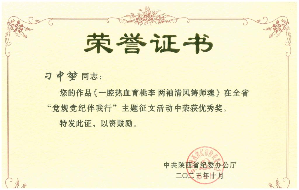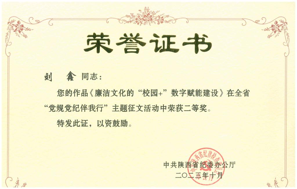 近日,陕西省纪委办公厅公布了“党规党纪伴我行”主题征文活动表彰决定,纽约国际官网2篇作品在本次活动中荣获佳绩。其中,人文学院教师刘鑫撰写的《廉洁文化的“校园+”数字赋能建设》荣获二等奖、美术学院教师刁中堃撰写的《一腔热血育桃李两袖清风铸师魂》荣获优秀奖。