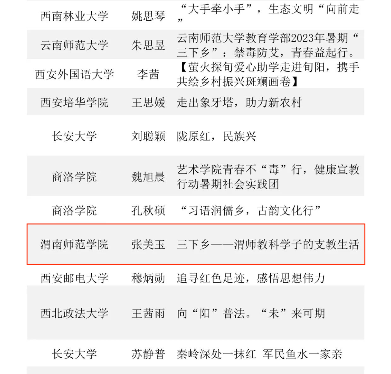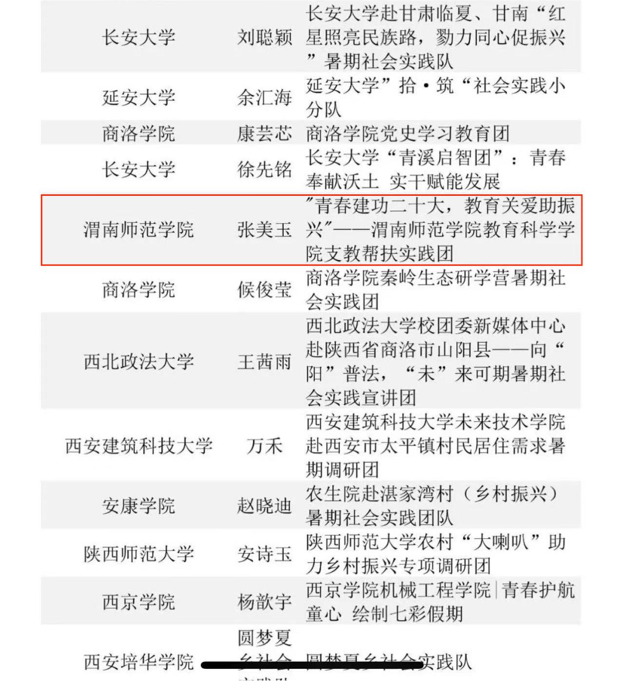 近日,在中国青年报社主办2023大学生社会实践成果“千校千项”网络展示活动中,纽约国际官网社会实践校级团队“青春建功二十大,教育关爱助振兴”——588888纽约国际线路教育科学学院支教帮扶实践团荣获2023大学生社会实践成果“千校千项”网络展示活动优秀项目奖,该实践团视频制作者张美玉《三下乡一一渭师教科学子的支教生活》荣获优秀视频奖。