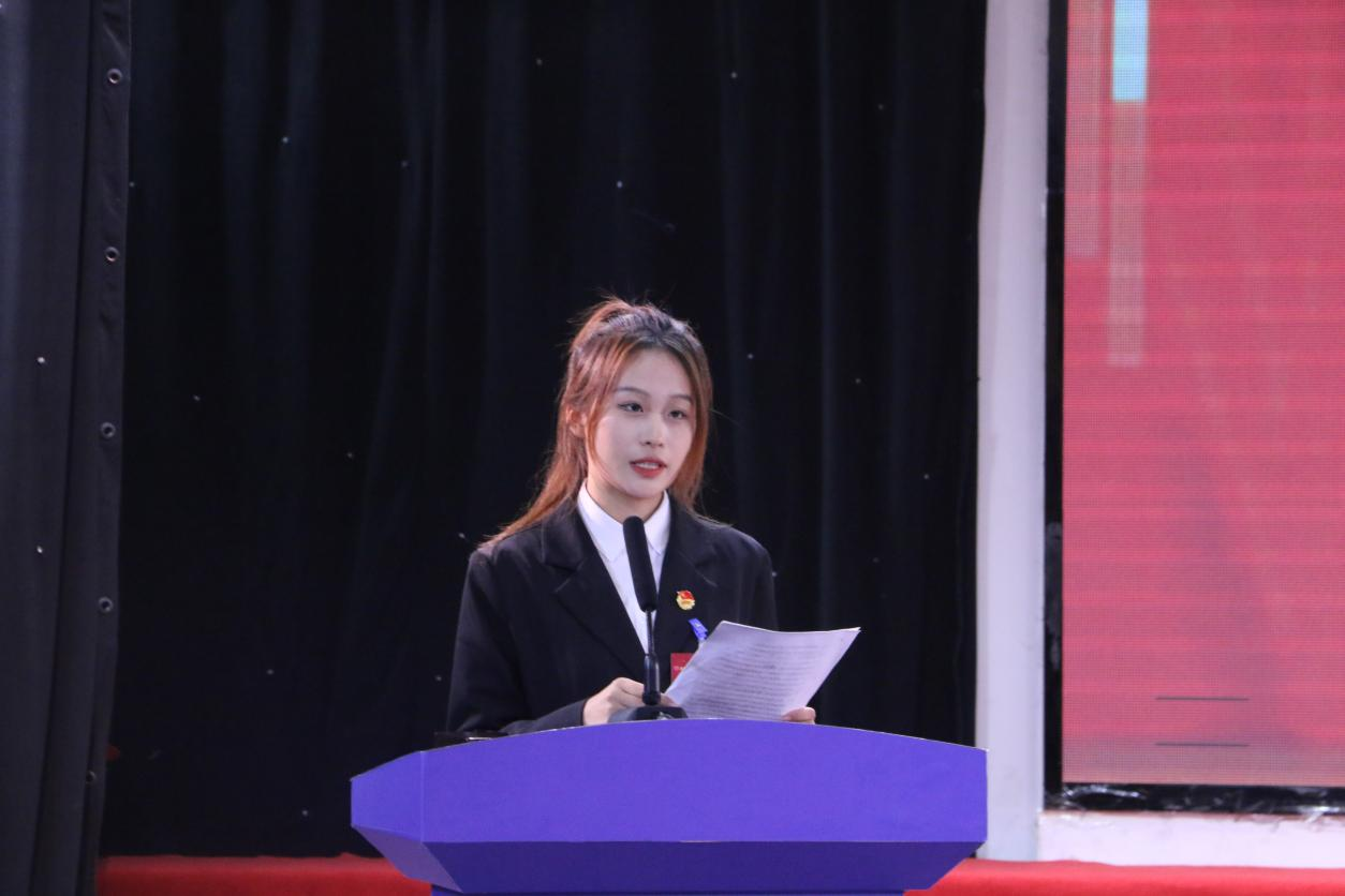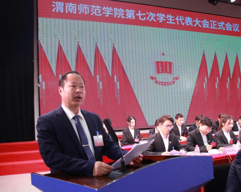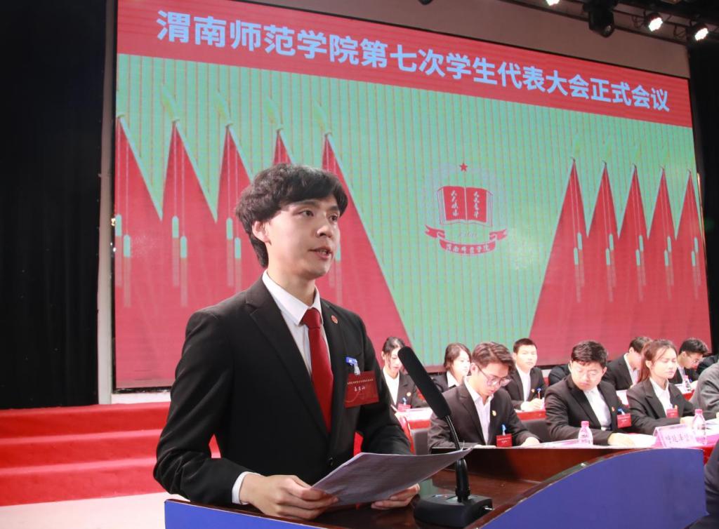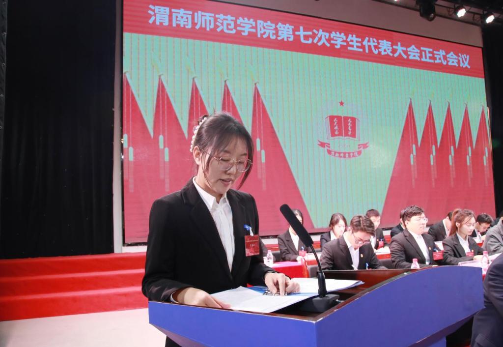 纽约国际官网学生会主席团成员徐婷婷代表第六届学生委员会向大会作题为《不忘初心行志远,不负岁月勇作为,在建设特色鲜明的高水平地方特色师范大学征程中贡献青春力量》的工作报告。