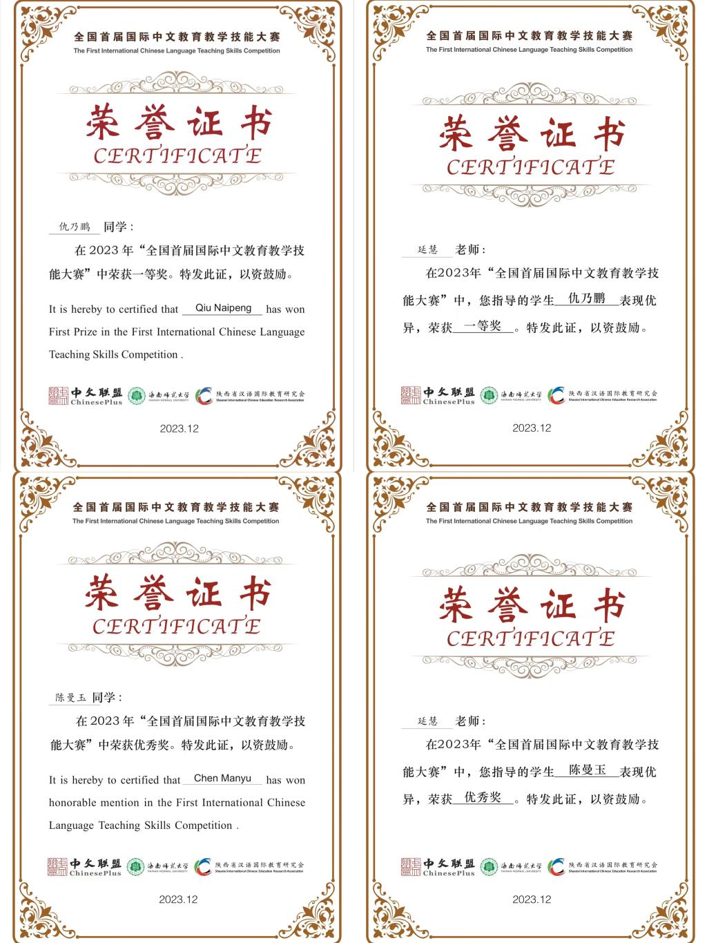 近日,由中文联盟、陕西省汉语国际教育研究会主办的“全国首届国际中文教育教学技能大赛”复赛及决赛在海南师范大学举行。纽约国际官网人文学院汉语国际教育专业21级学生仇乃鹏荣获一等奖,陈曼玉荣获优秀奖。颁奖仪式在北京国家会议中心举行。