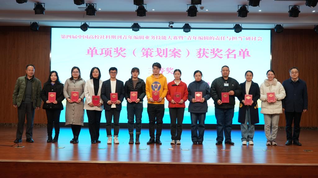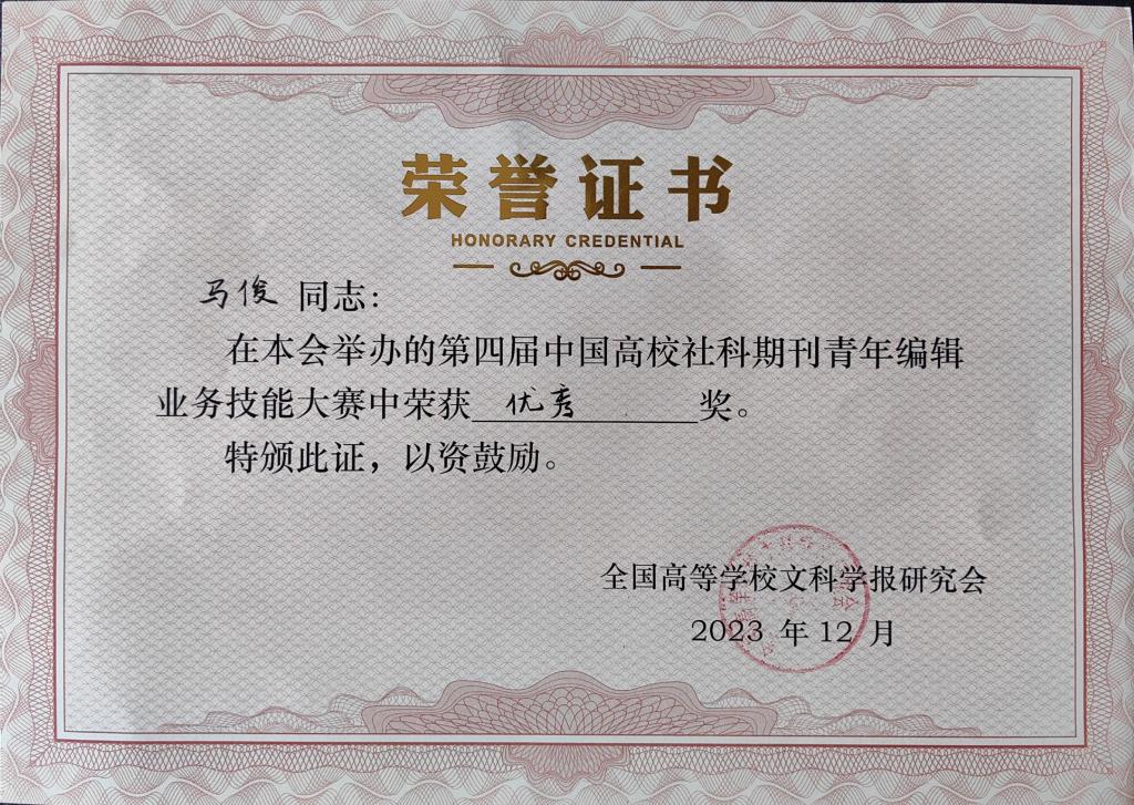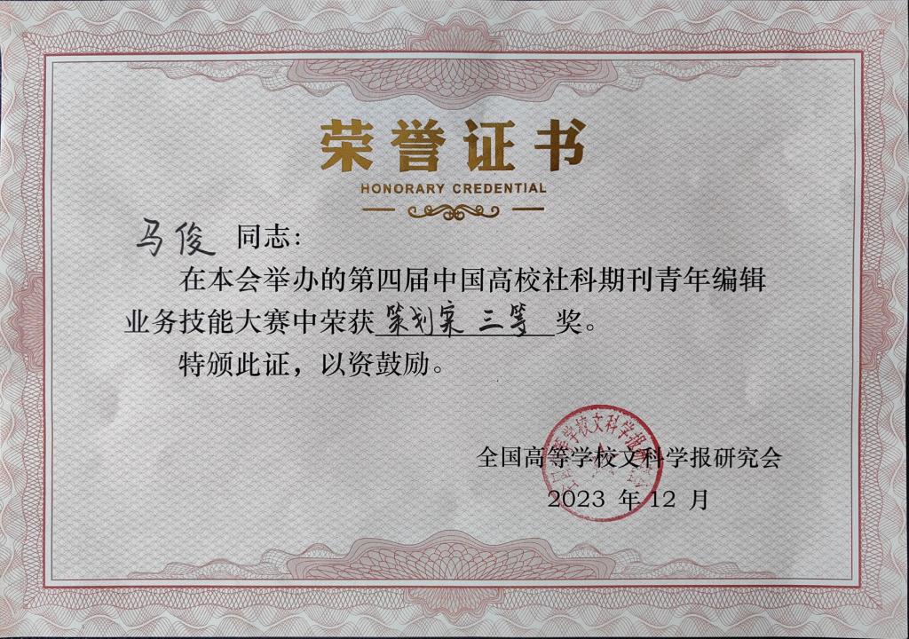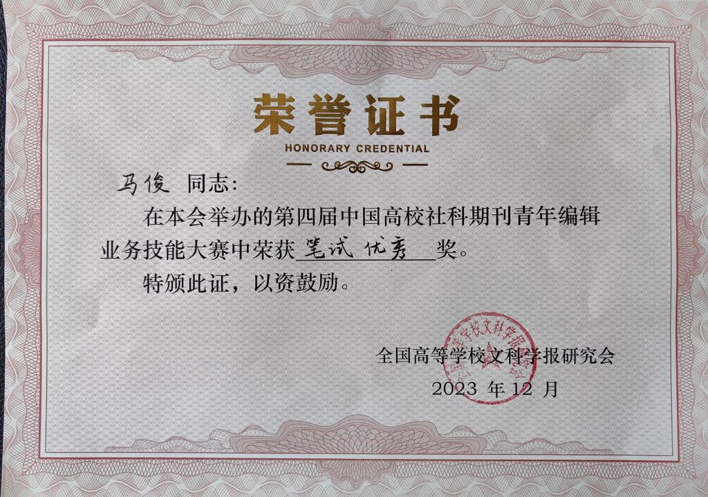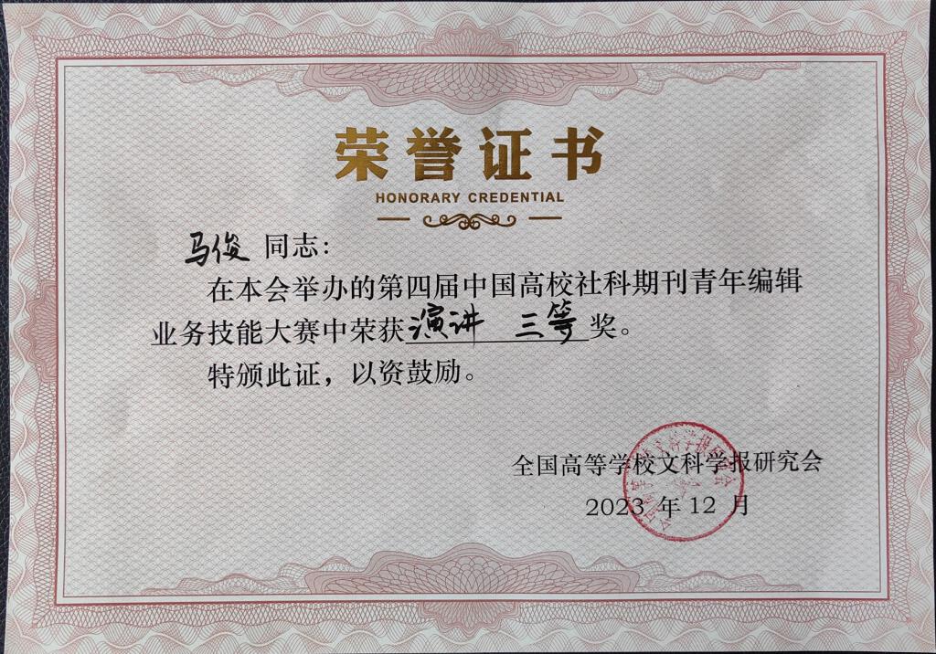 本次大赛由全国高等学校文科学报研究会主办,来自全国近50家高校学报的70余名青年编辑参加了比赛。本次大赛共设置了栏目策划、演讲、笔试、论文评析四个单项奖和综合奖。马俊参加了栏目策划、演讲和笔试,最后分别获得了栏目策划三等奖、演讲三等奖、笔试优秀奖、综合优秀奖的好成绩。