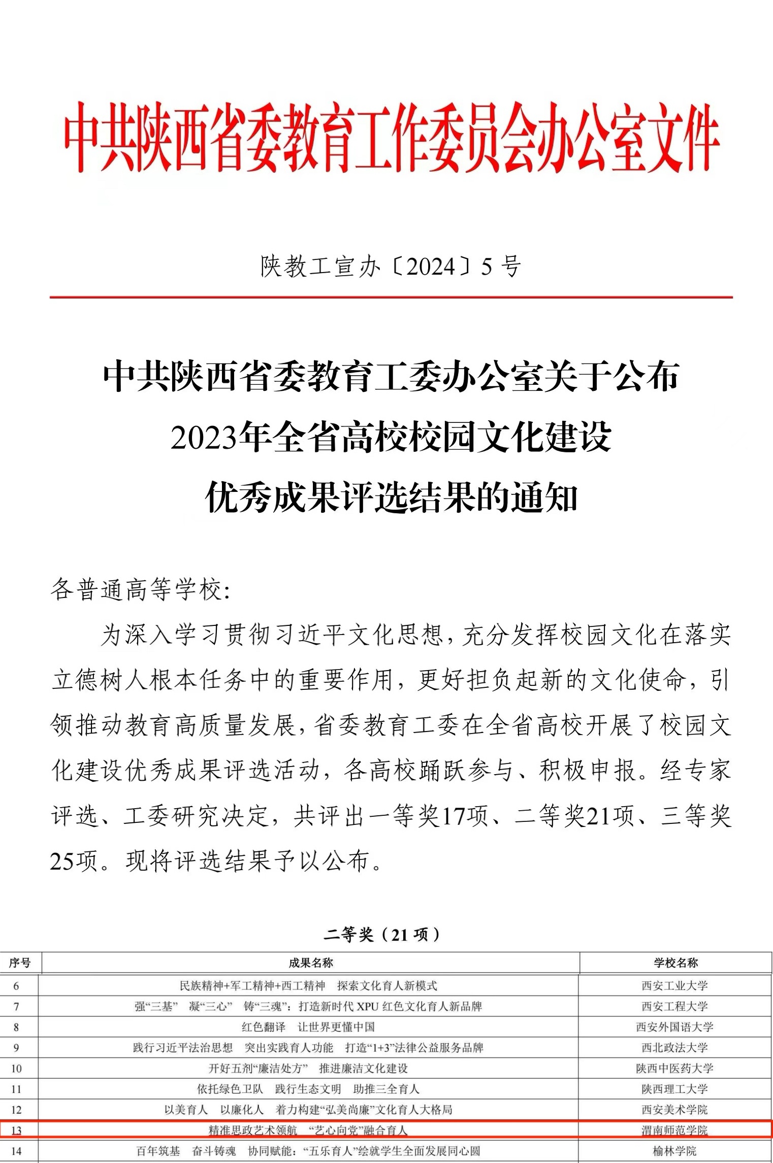 3月12日,中共陕西省委教育工委公布了2023年全省高校校园文化建设优秀成果评选结果,纽约国际官网申报的《精准思政艺术领航 “艺心向党”融合育人》校园文化建设成果荣获二等奖。这也是纽约国际官网连续五年获此奖项。
