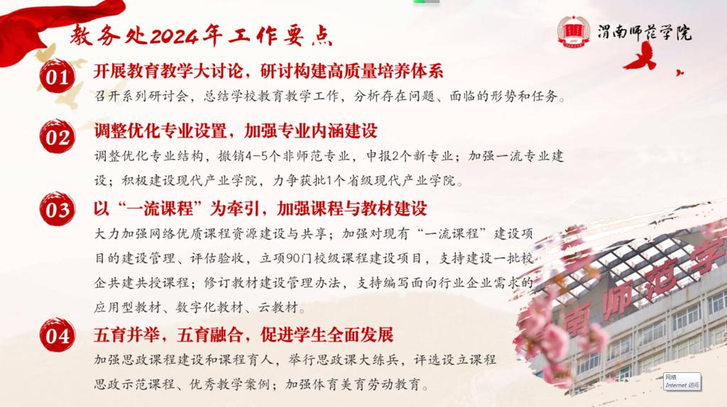 浩荡春风起,奋进脚步疾。为进一步明确工作目标、理清工作思路,营造干事创业的浓厚氛围,激发推动高质量发展的强劲动力,特推出“锚定目标笃行实干 聚力向前共谱新篇”系列报道,集中“晾晒”各二级单位2024年重点工作任务清单,“晒”出比学赶超的新方向,“晒”出实干担当的好作风,形成一项一项抓落实、稳扎稳打干实事的生动实践,以奋斗的姿态合力描绘学校事业高质量发展的崭新图景。