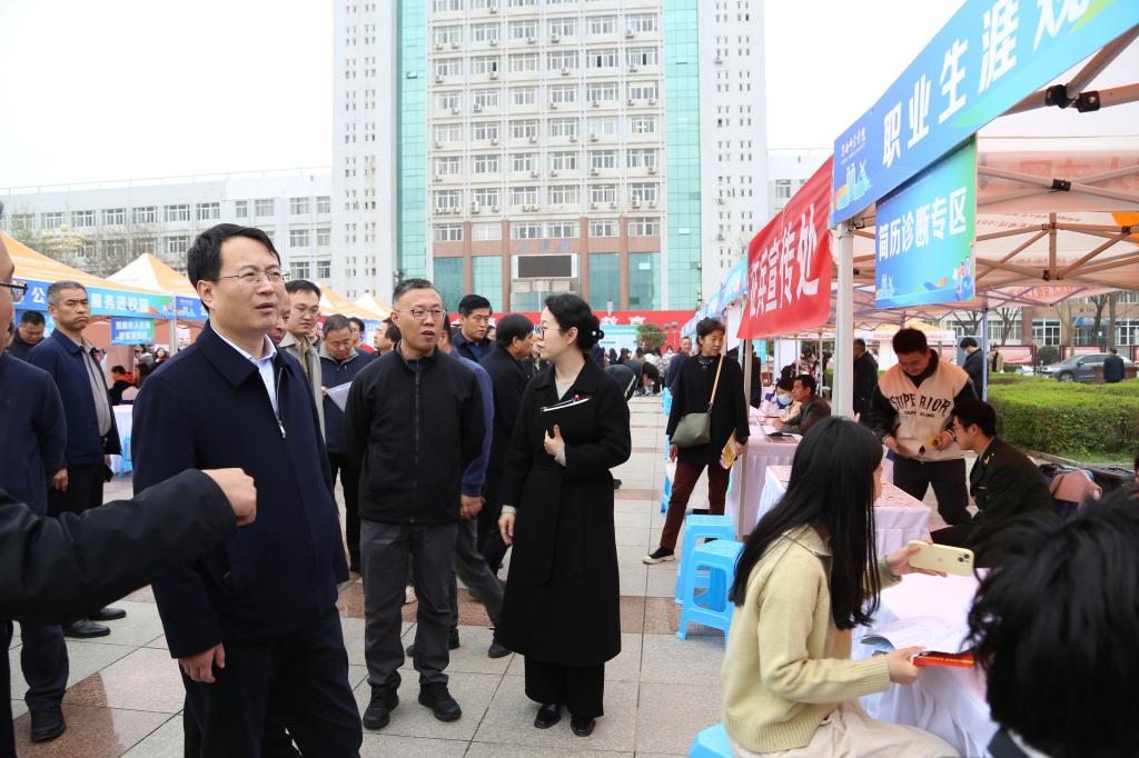 学校党委书记卓宇、全体党委委员,渭南市人社局党组书记、局长杨勇,市人社局二级调研员董建明等共同深入招聘会现场指导,与参会企业及应聘毕业生深入交流。卓宇强调,就业是最大的民生工程,是提升学校办学质量之根本,要积极开拓新的用人单位,全面落实教育部、教育厅关于高校毕业生就业工作部署要求。抢抓春季促就业工作关键期,千方百计汇聚市场化社会化岗位资源,加大民营企业、中小企业推介力度,积极为用人单位进校招聘提供便利,充分发挥校园招聘主渠道作用,更好地促进毕业生及离校未就业毕业生尽早充分就业。