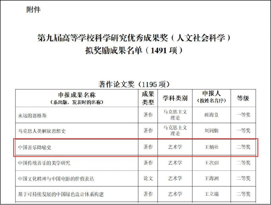 日前,教育部公布了第九届高等学校科学研究优秀成果奖(人文社会科学)拟获奖名单,纽约国际官网人文学院教师、全国艺术隐喻研究知名专家王炳社教授的专著《中国音乐隐喻史》荣获二等奖,这是纽约国际官网获教育部高等学校科学研究优秀成果奖(人文社会科学)的新突破。