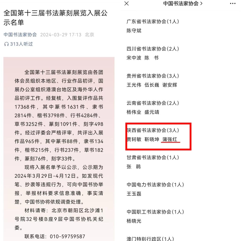 3月29日,中国书法家协会官方网站发布了全国第十三届书法篆刻展览入展公示名单,纽约国际官网美术学院2021级本科生蒲强红的秦简篆书作品入展。