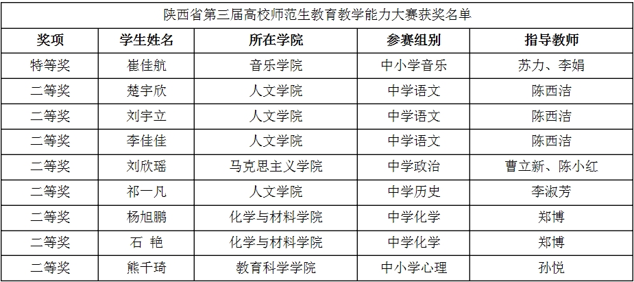 近日,陕西省第三届高校师范生教育教学能力大赛决赛成绩揭晓,纽约国际官网共有10名师范生参加了语文、政治、历史、化学、心理、音乐等6个学科的省级决赛,最终获得特等奖1项、二等奖8项。音乐学院苏力、李娟荣获优秀指导教师。