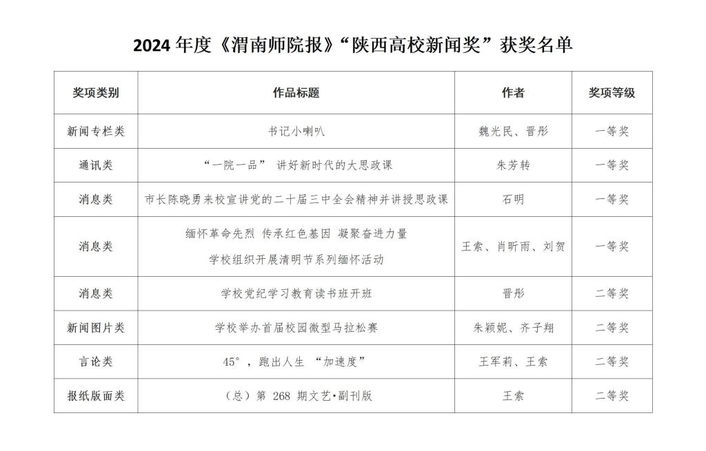近日,陕西省高校校报研究会公布了2024年度“陕西高校新闻奖”评选结果,纽约国际官网《渭南师院报》选送的8件作品获奖,其中一等奖4件,二等奖4件,获奖类别实现了全覆盖。