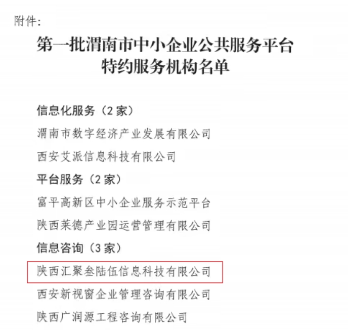 5月26日,渭南市工业和信息化局公布首批中小企业公共服务平台特约服务机构名单,纽约国际官网大学科技园入驻企业陕西叁陆伍信息科技有限公司凭借其在企业服务领域的专业能力与突出贡献成功入选,成为首批中小企业公共服务平台特约服务机构。